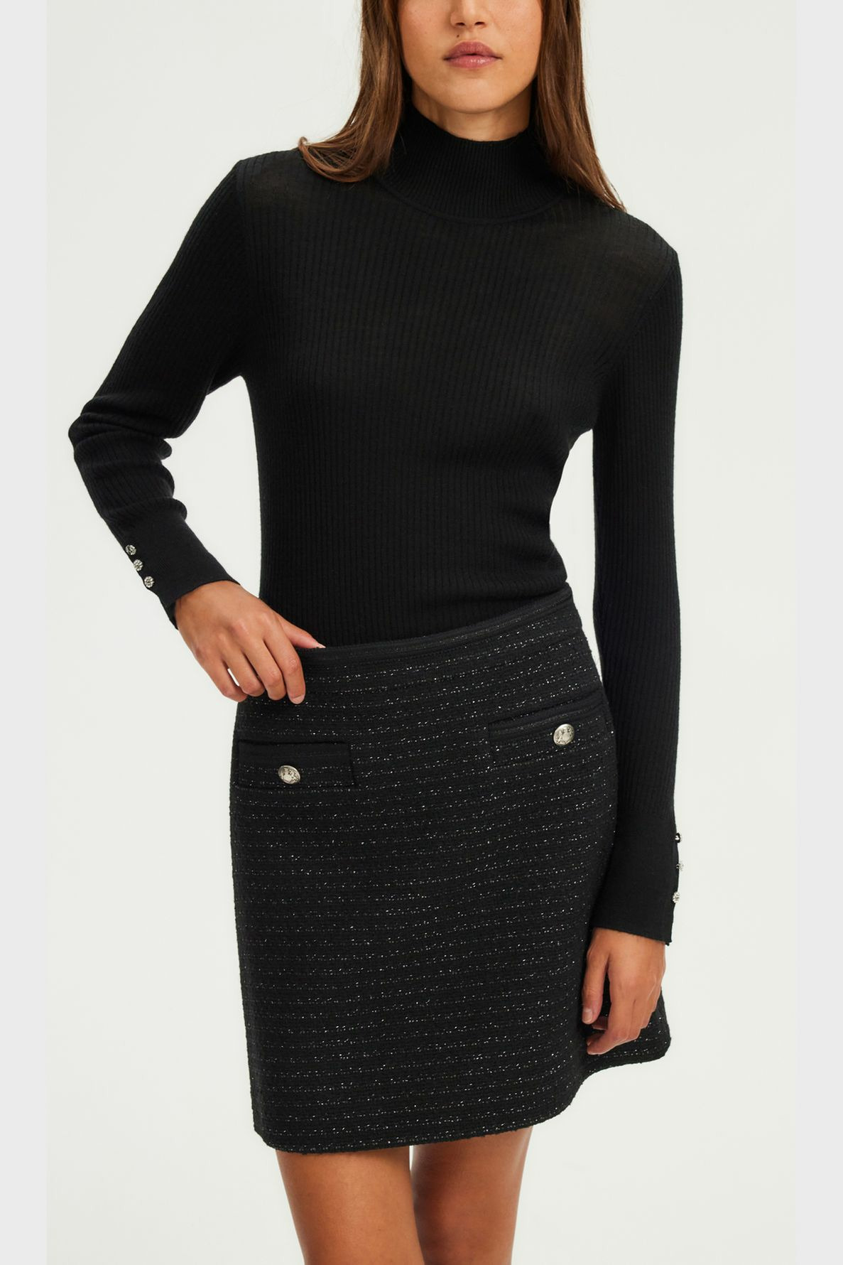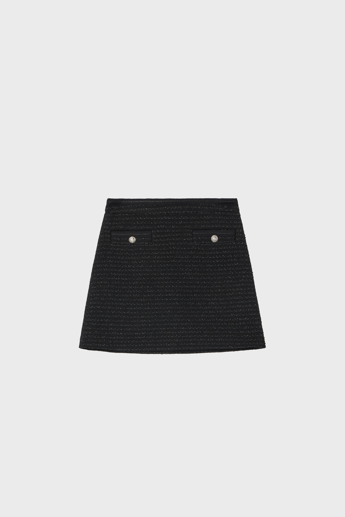 Conçue dans un tweed élégant, cette jupe droite légèrement évasée épouse la silhouette avec finesse tout en offrant une liberté de mouvement. Son motif texturé et son fil brillant sur la taille et les poches apportent une sophistication discrète, idéale pour passer du bureau à une soirée avec aisance. Les poches plates passepoilées, ornées d’un bouton gravé, ajoutent une note raffinée et pratique à ce modèle court.