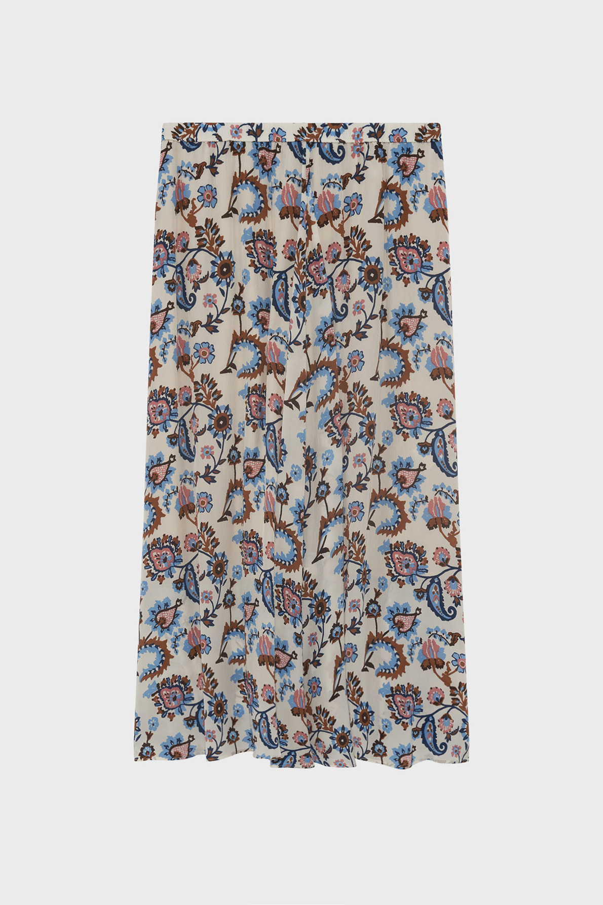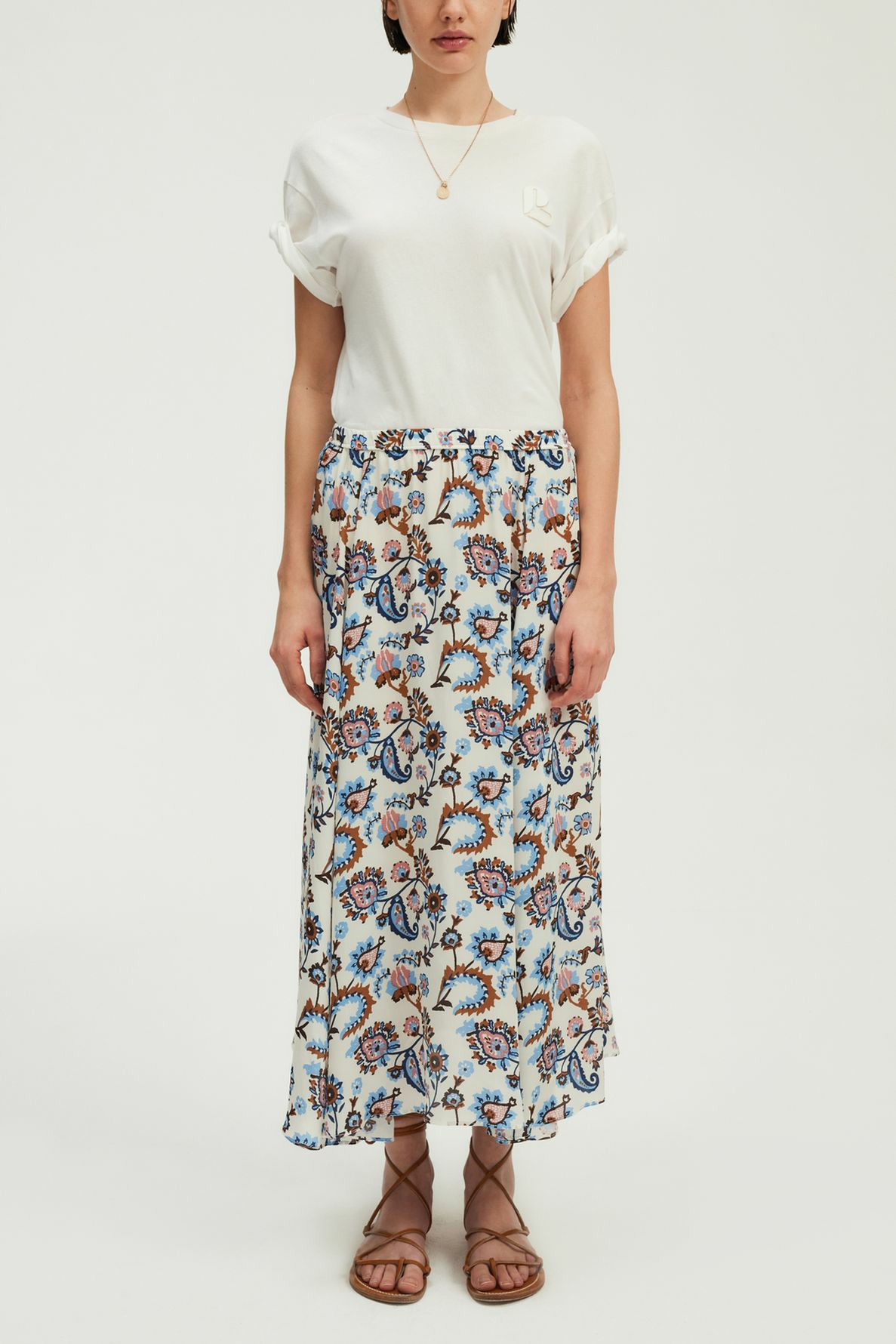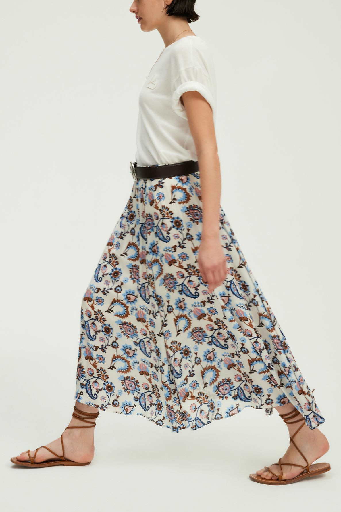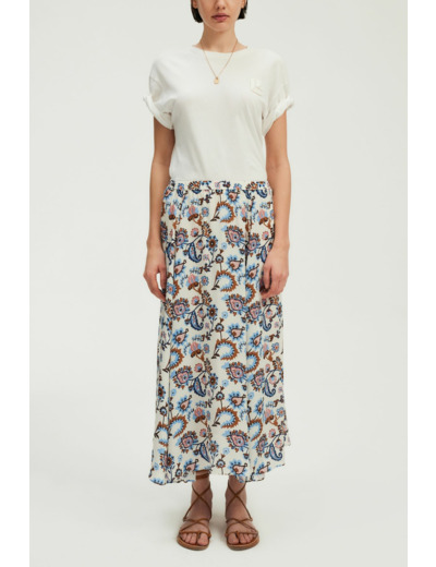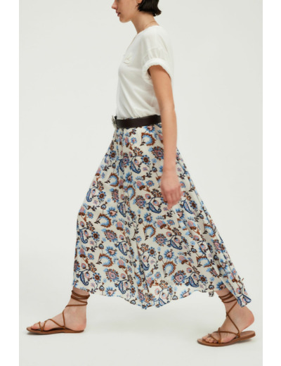Matière fluide à l’aspect soyeux, jupe doublée. Coupe large avec bas asymétrique. Motif végétal imprimé. Longueur midi. Taille élastiquée pour un maintien confortable.