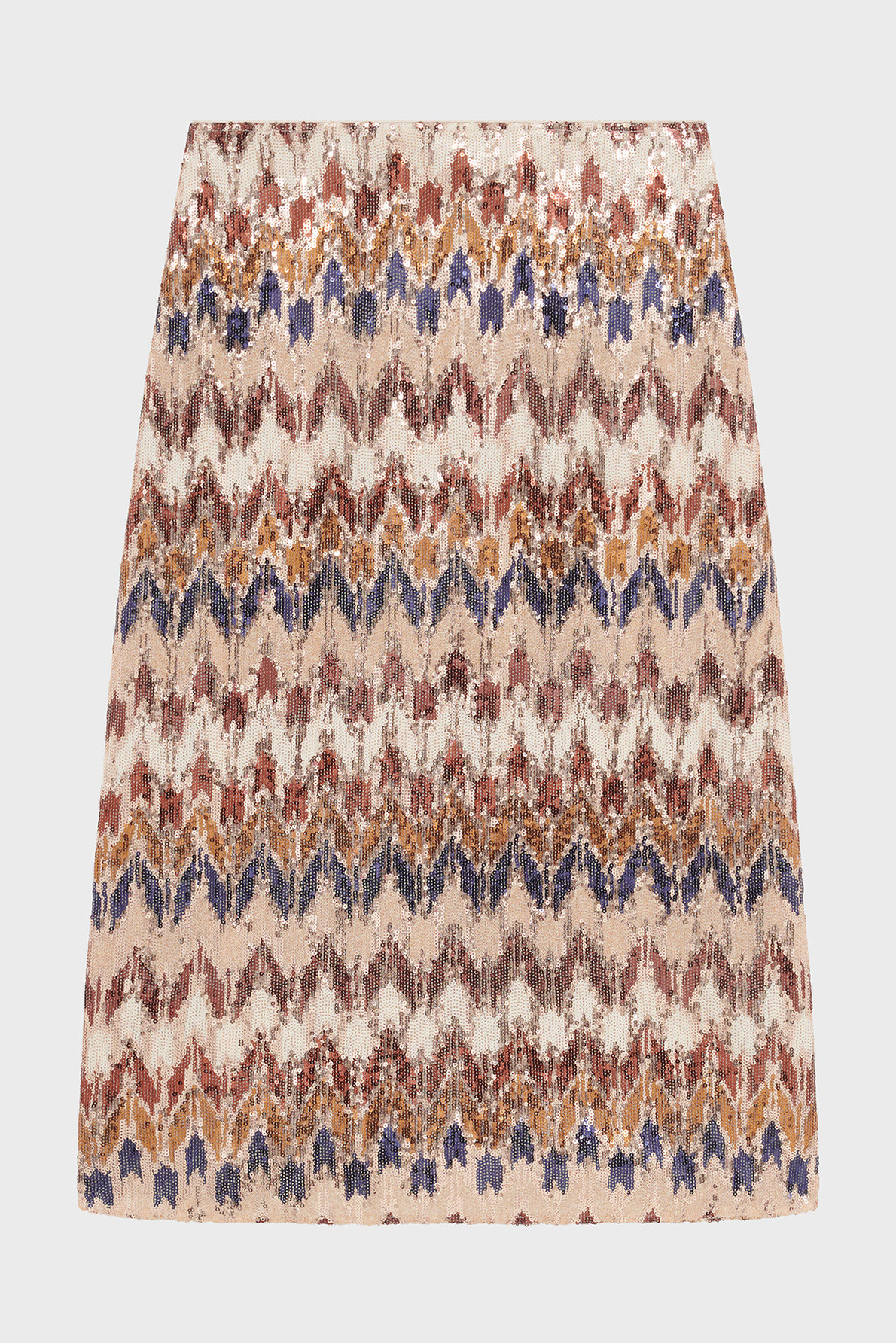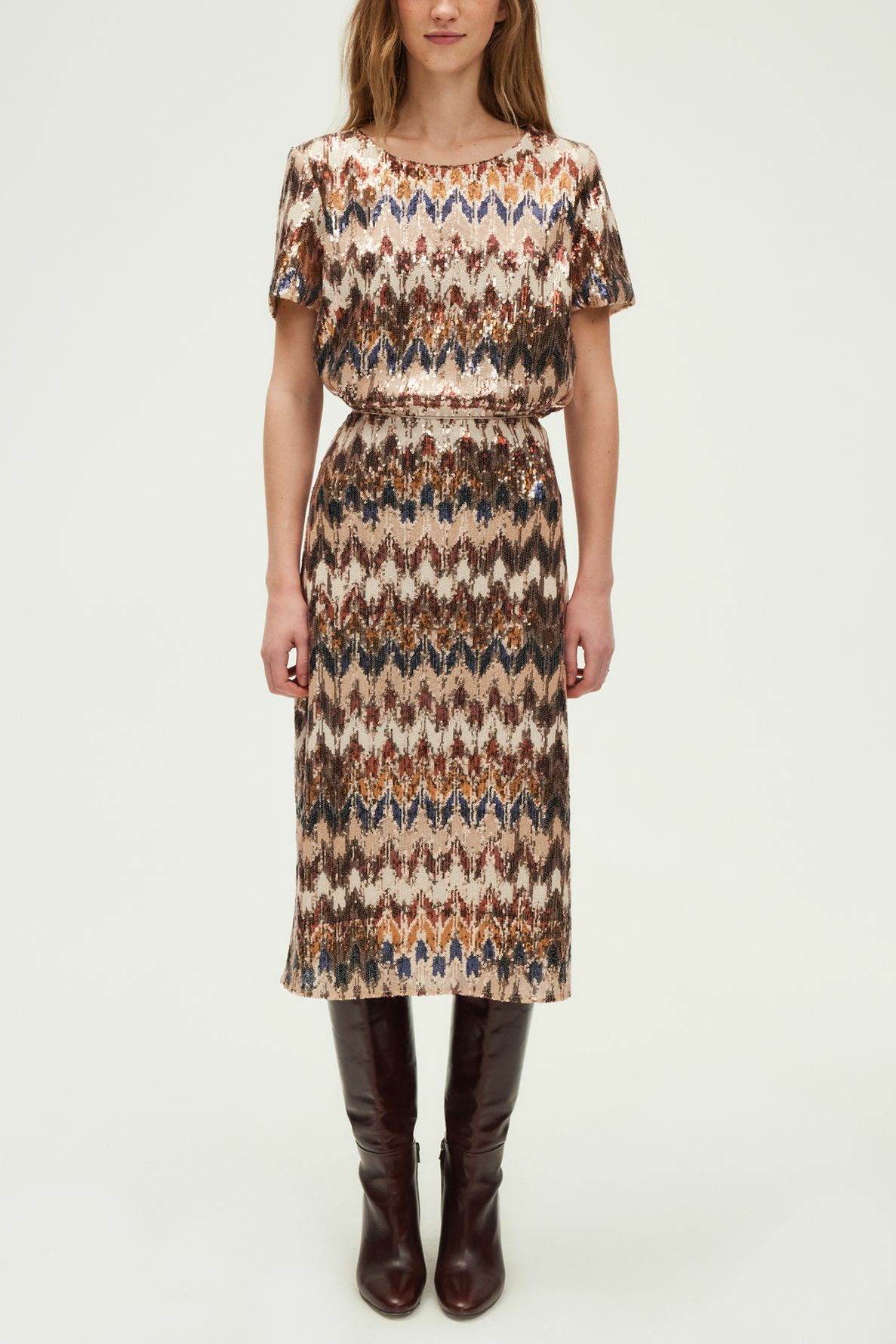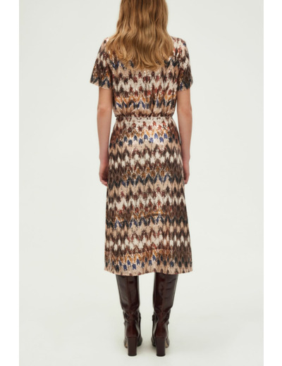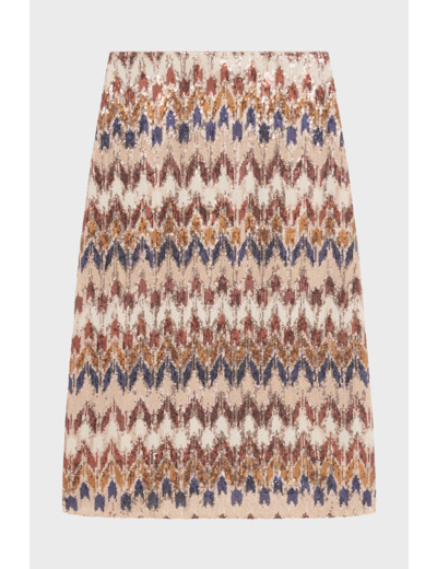 Longueur midi, coupe droite légèrement évasée en bas, motifs géométriques brodés de sequins, fermeture par zip latéral invisible.