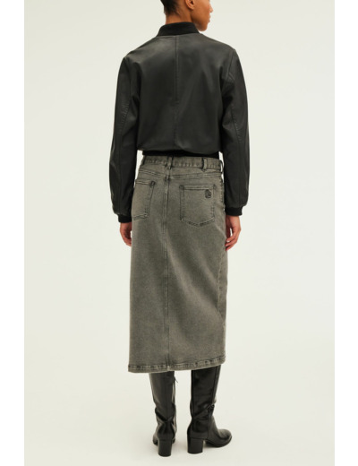 Adoptez une allure affirmée avec cette jupe midi droite en denim anthracite, un essentiel pour un style urbain et audacieux. Associez-la à une veste en cuir pour une silhouette rock et contemporaine.