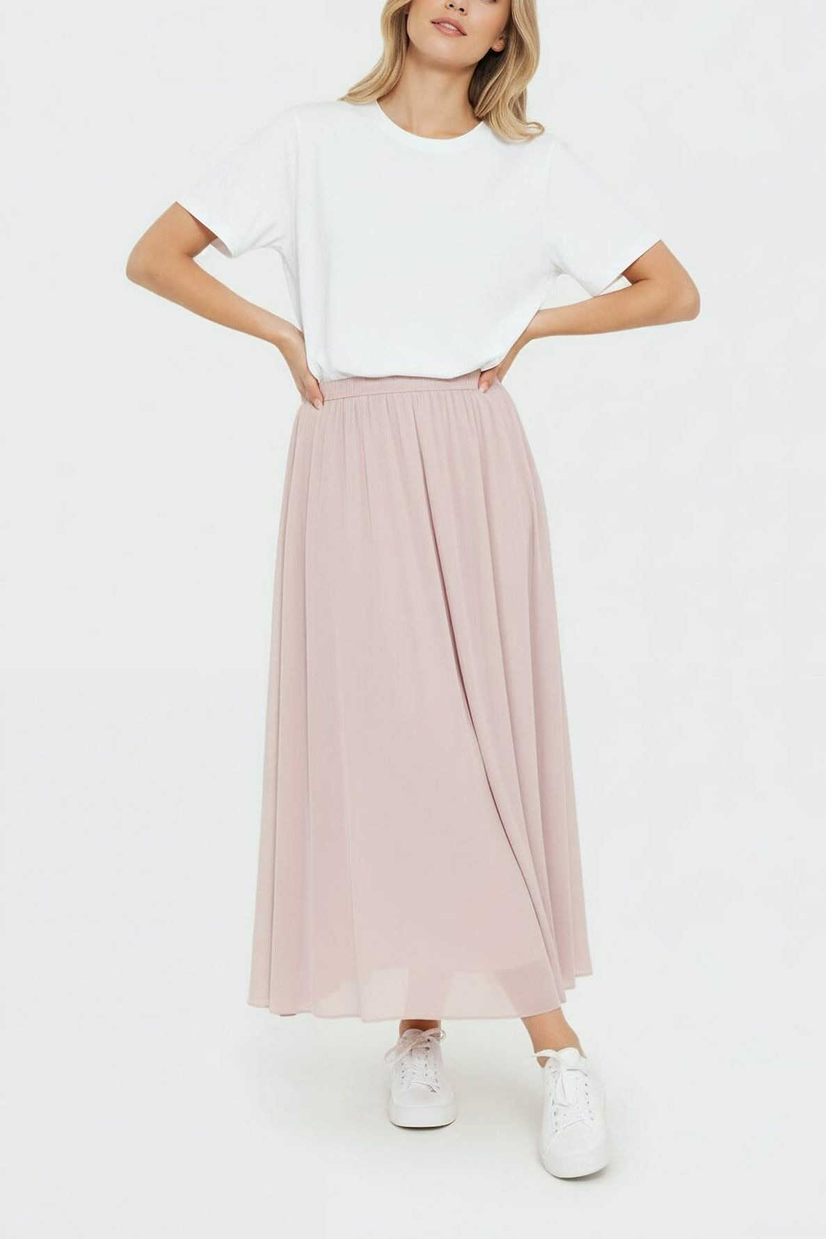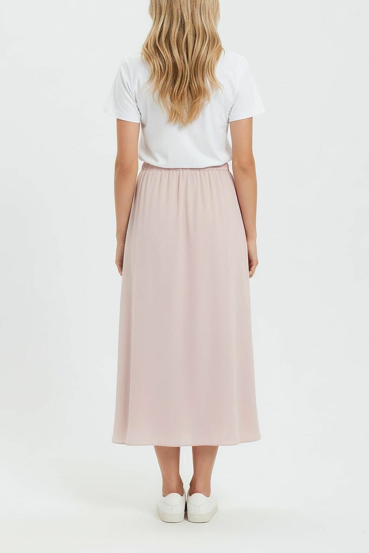 Jupe midi en satin uni, légèrement plissée. Taille élastiquée pour un maintien confortable. Longueur midi, idéale pour un style élégant et polyvalent. Couleur nude, facile à associer avec vos pièces favorites.