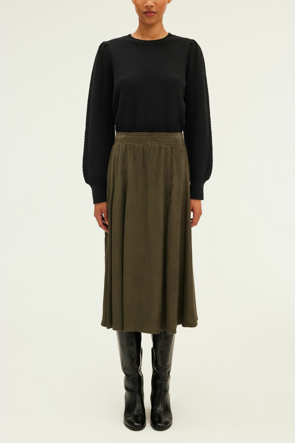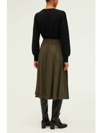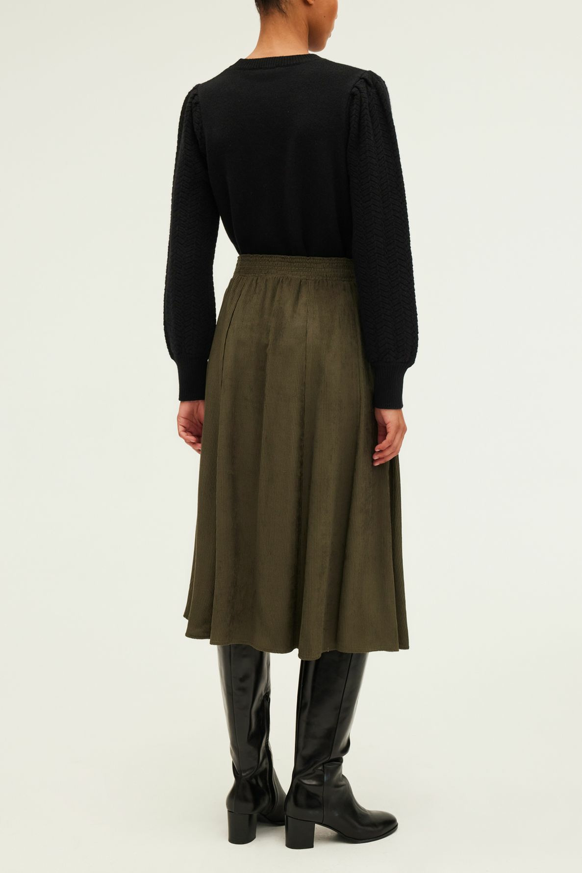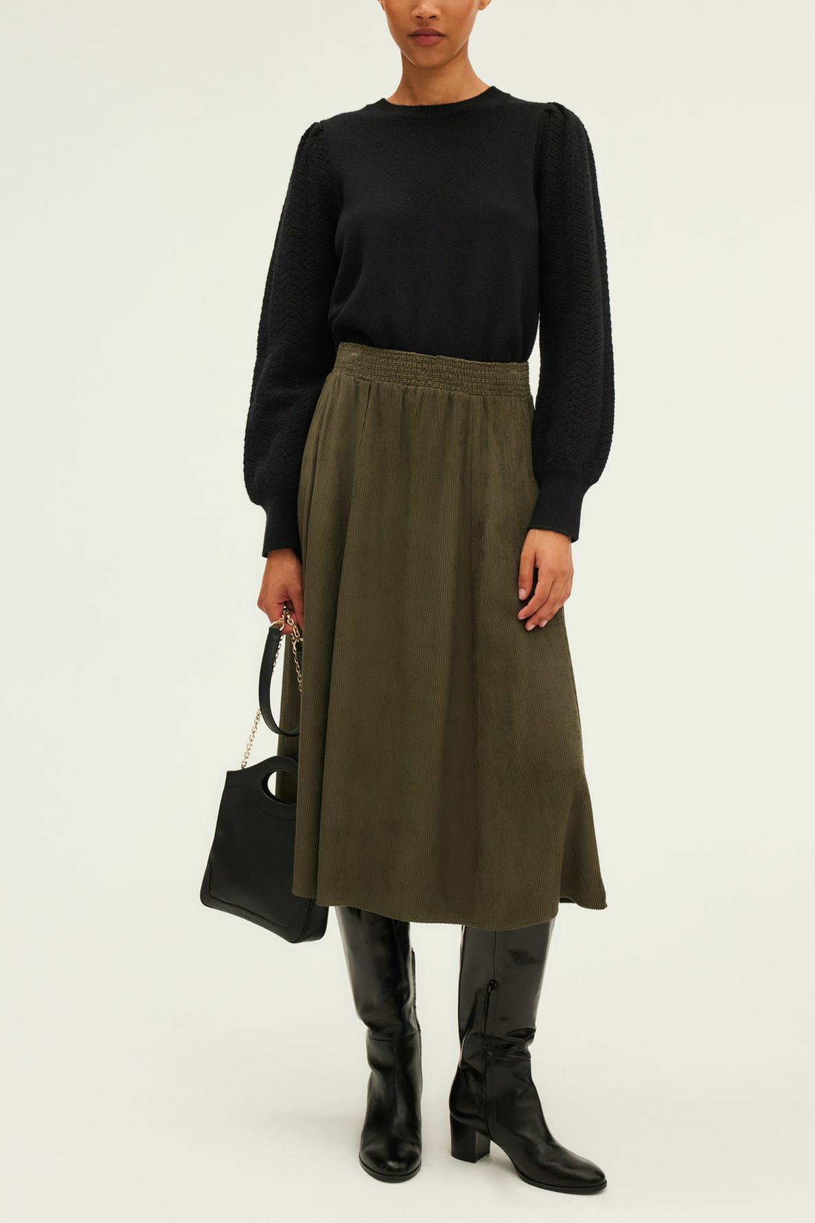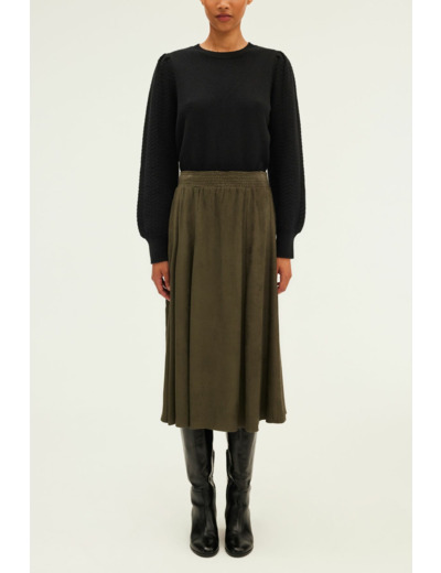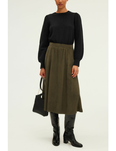 Adoptez l’élégance décontractée avec cette jupe midi en velours fluide à côtes, idéale pour sublimer votre silhouette avec une touche de modernité. Sa teinte kaki profond apporte une note naturelle et sophistiquée à toutes vos tenues.