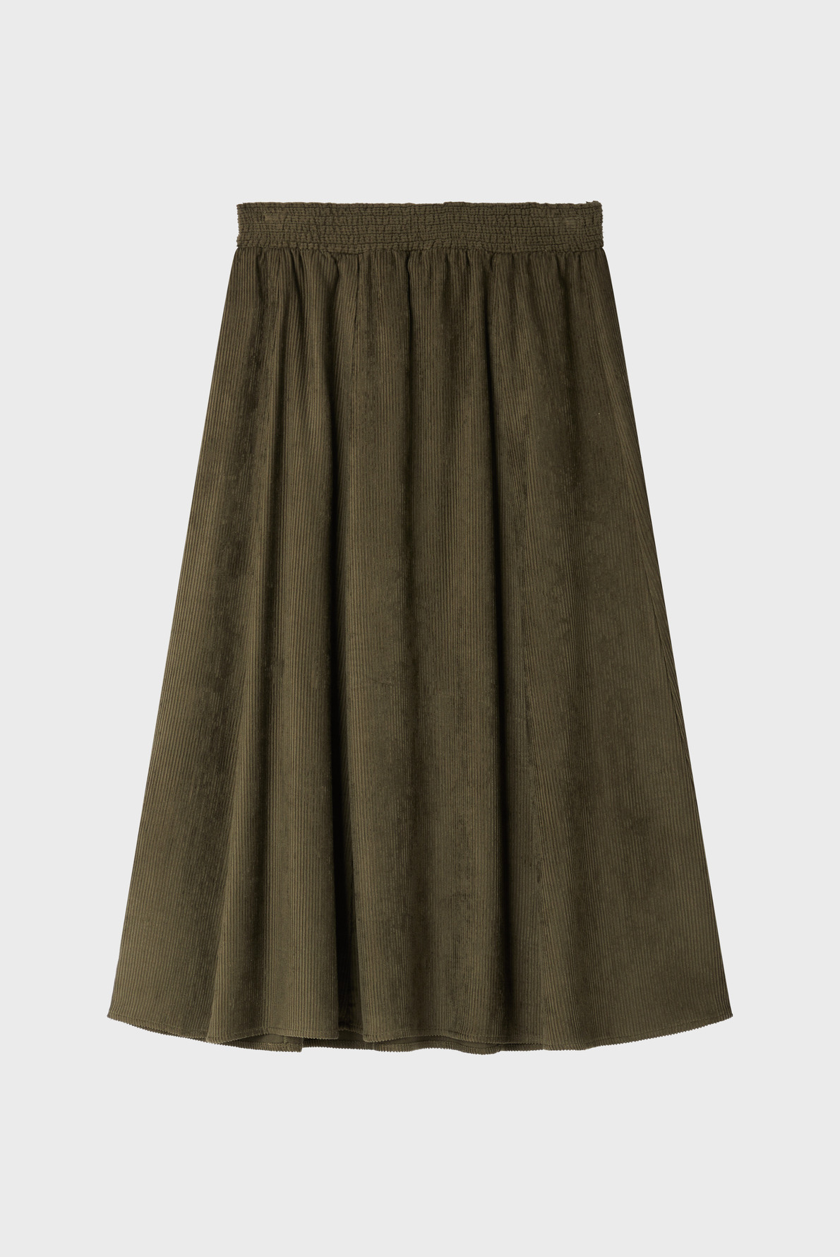 Velours uni à côtes, forme trapèze, longueur midi, taille élastiquée. La mannequin mesure 180 cm et porte une taille 2.