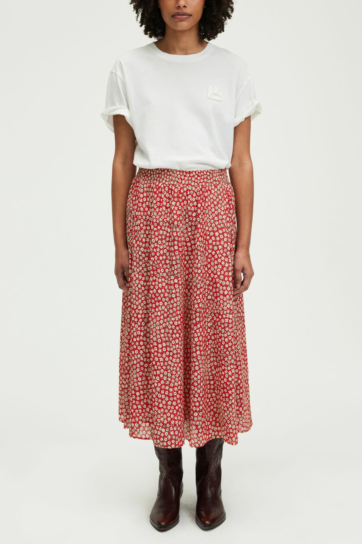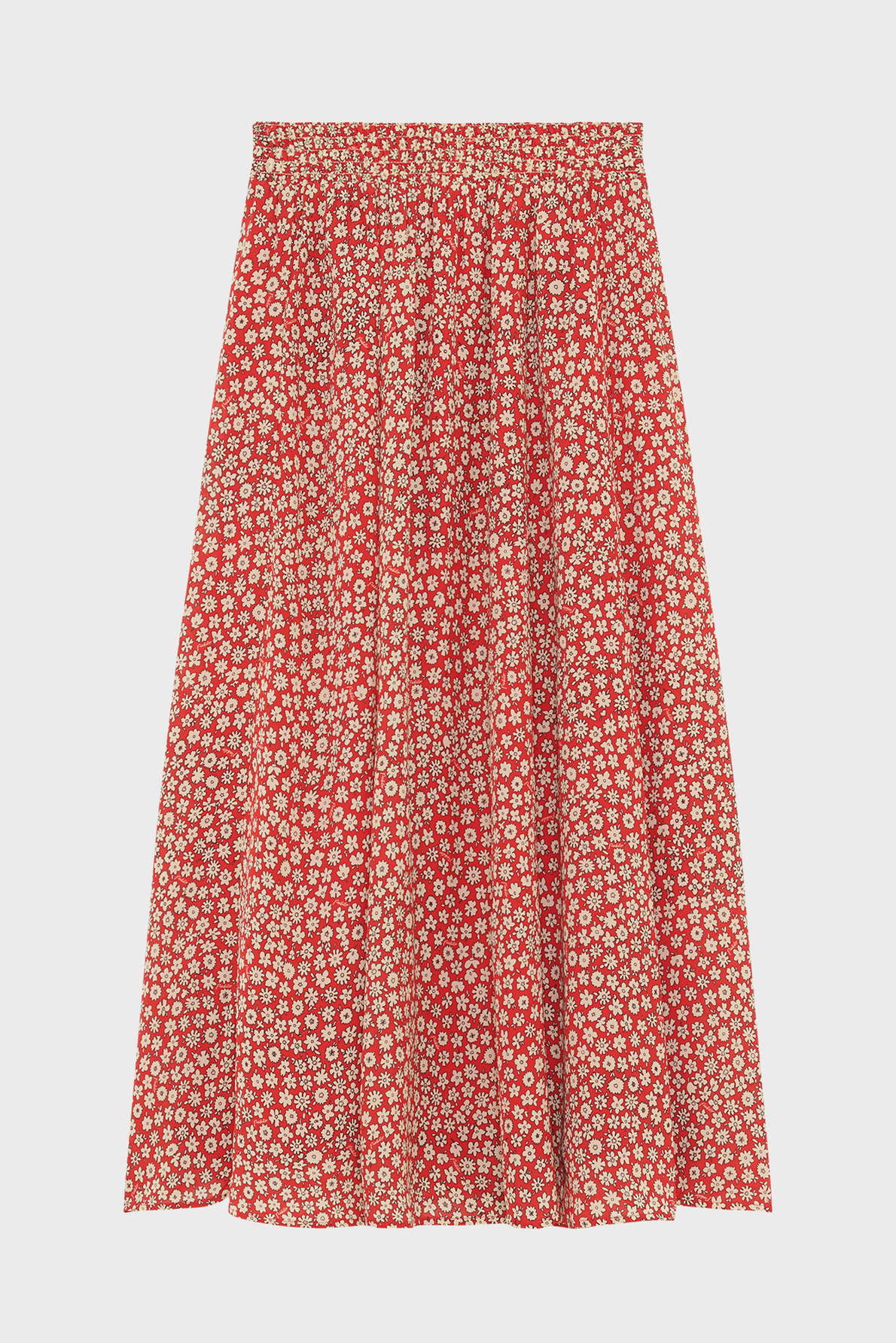Jupe midi fluide avec motif floral, taille élastiquée à smocks, forme évasée, petits plis sous la ceinture, longueur midi.