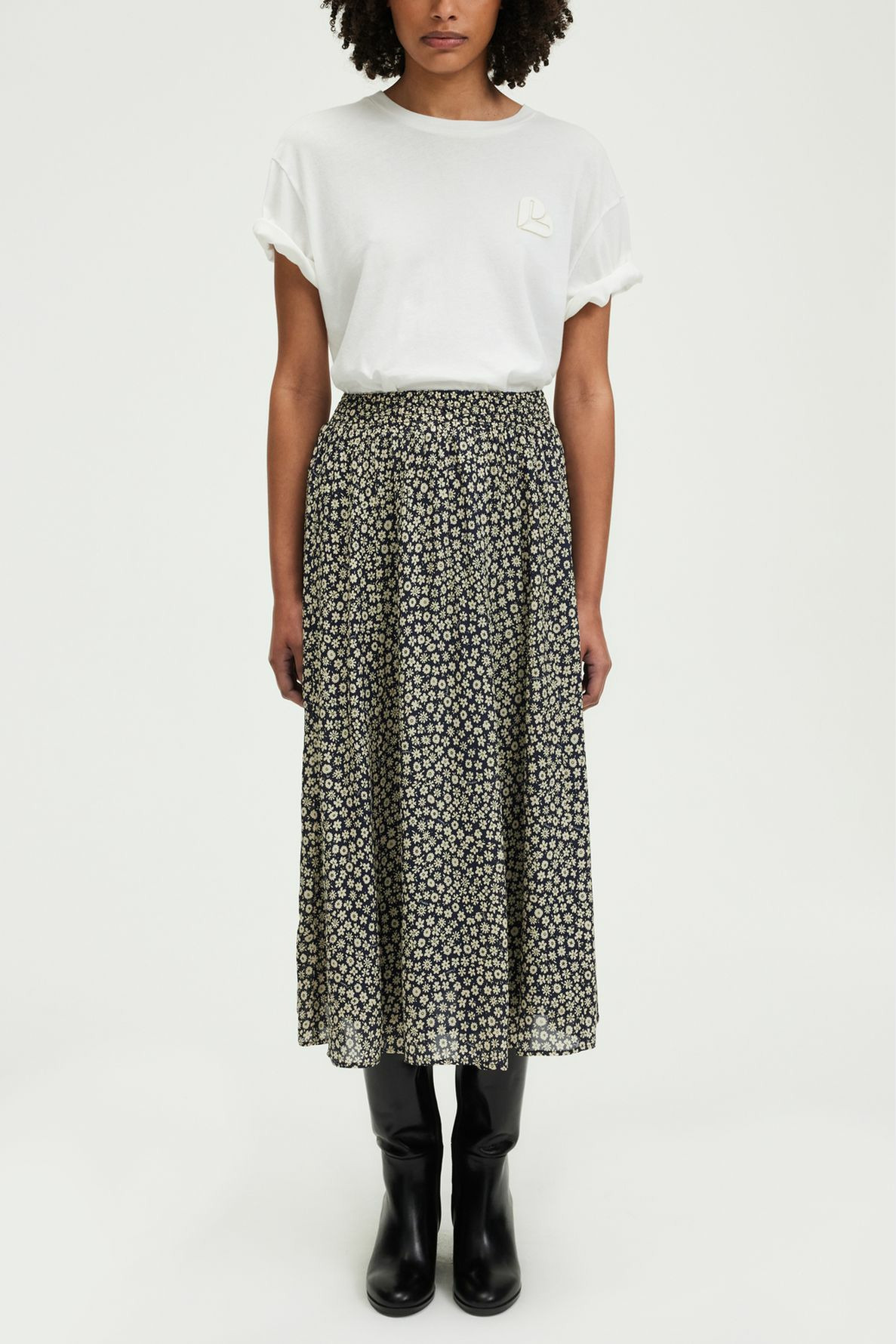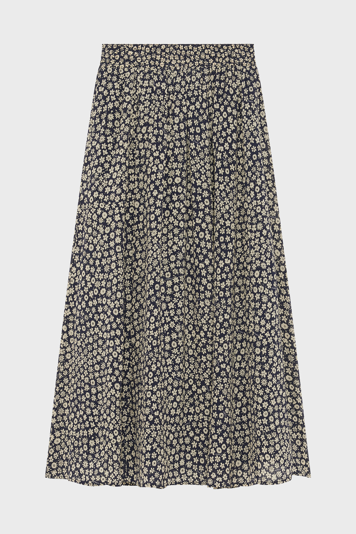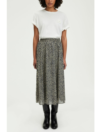 Jupe midi fluide avec motif floral, taille élastiquée à smocks, forme évasée, petits plis sous la ceinture, longueur midi.