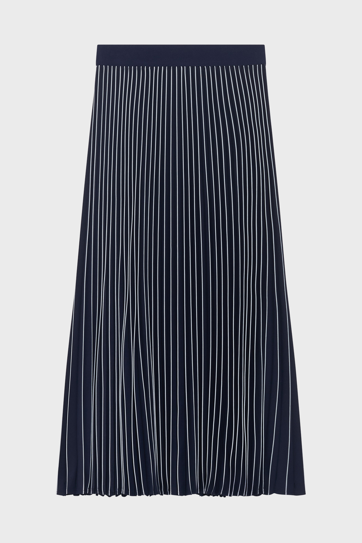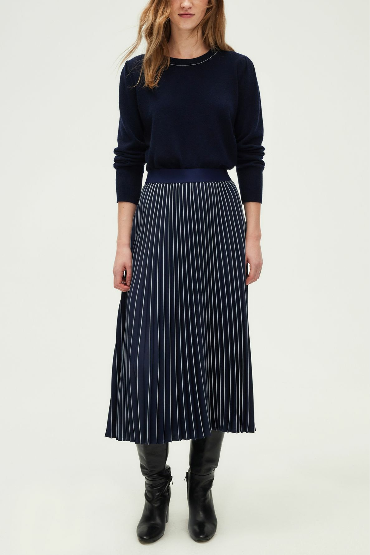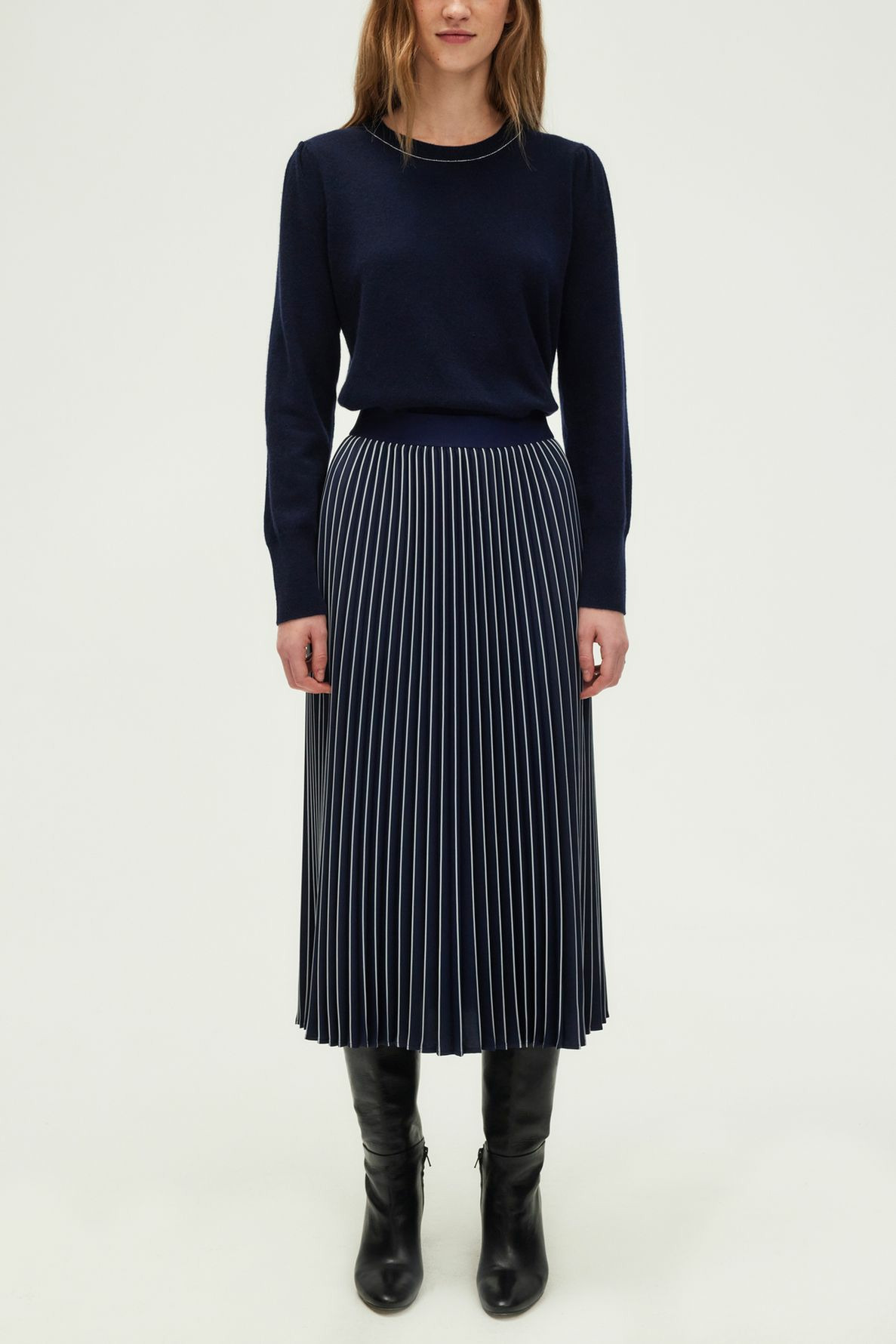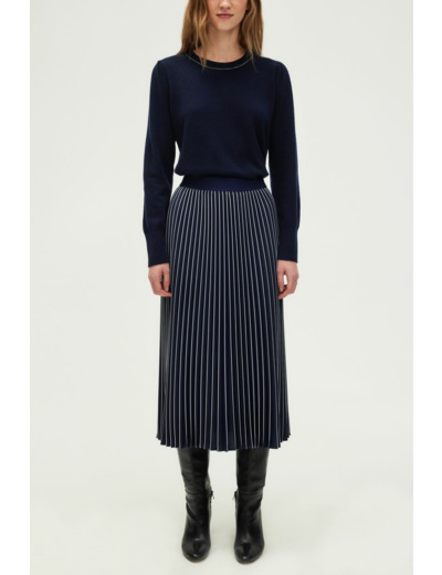 Forme plissée, motif à rayures bicolores avec bandes blanches incrustées de lurex, longueur midi, taille élastiquée pour un ajustement confortable.