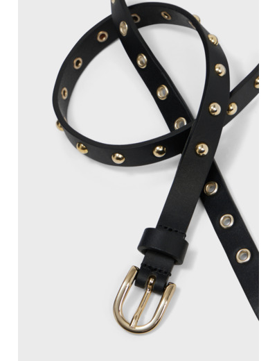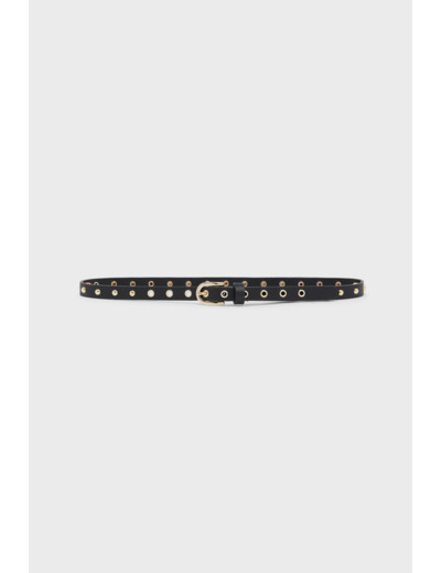 Hauteur : 1.5 cm. Ceinture fine en cuir lisse non doublée. Clous dorés disposés sur toute la longueur. Fermeture par boucle avec 9 trous de réglage munis d’œillets.