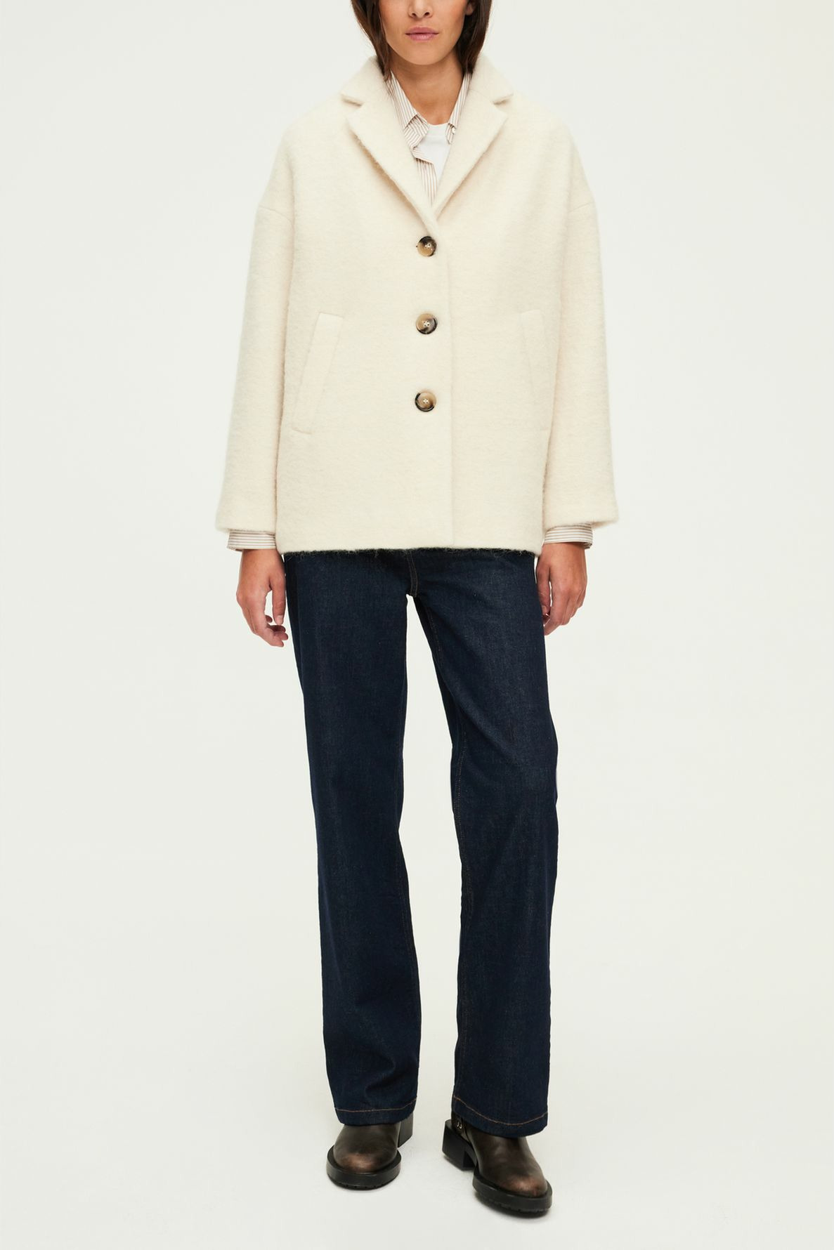 Manteau court à effet poilu en coton et laine mélangés. Forme droite et ample avec emmanchure basse. Tissu uni texturé. Col tailleur, manches longues. Fermeture par trois boutons ronds. Poches passepoilées en biais. La mannequin mesure 180 cm et porte une taille 2.
