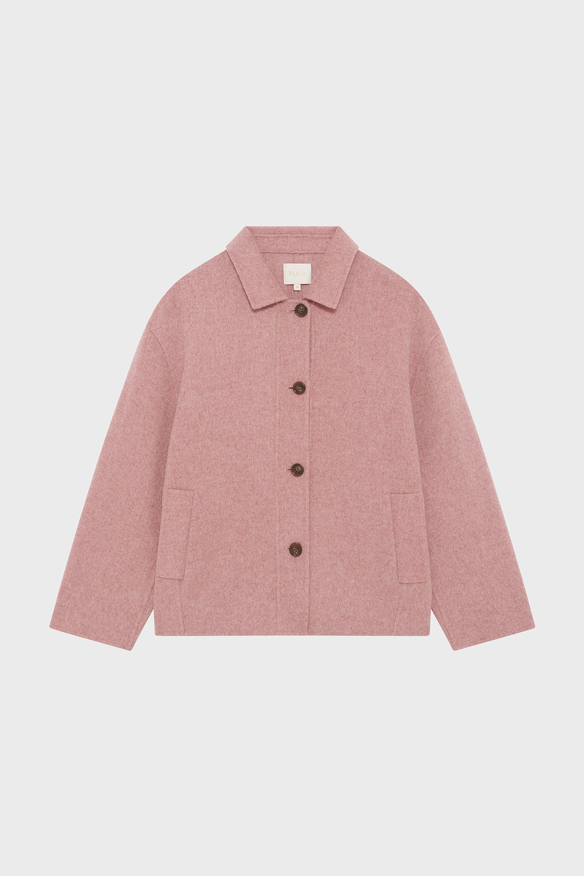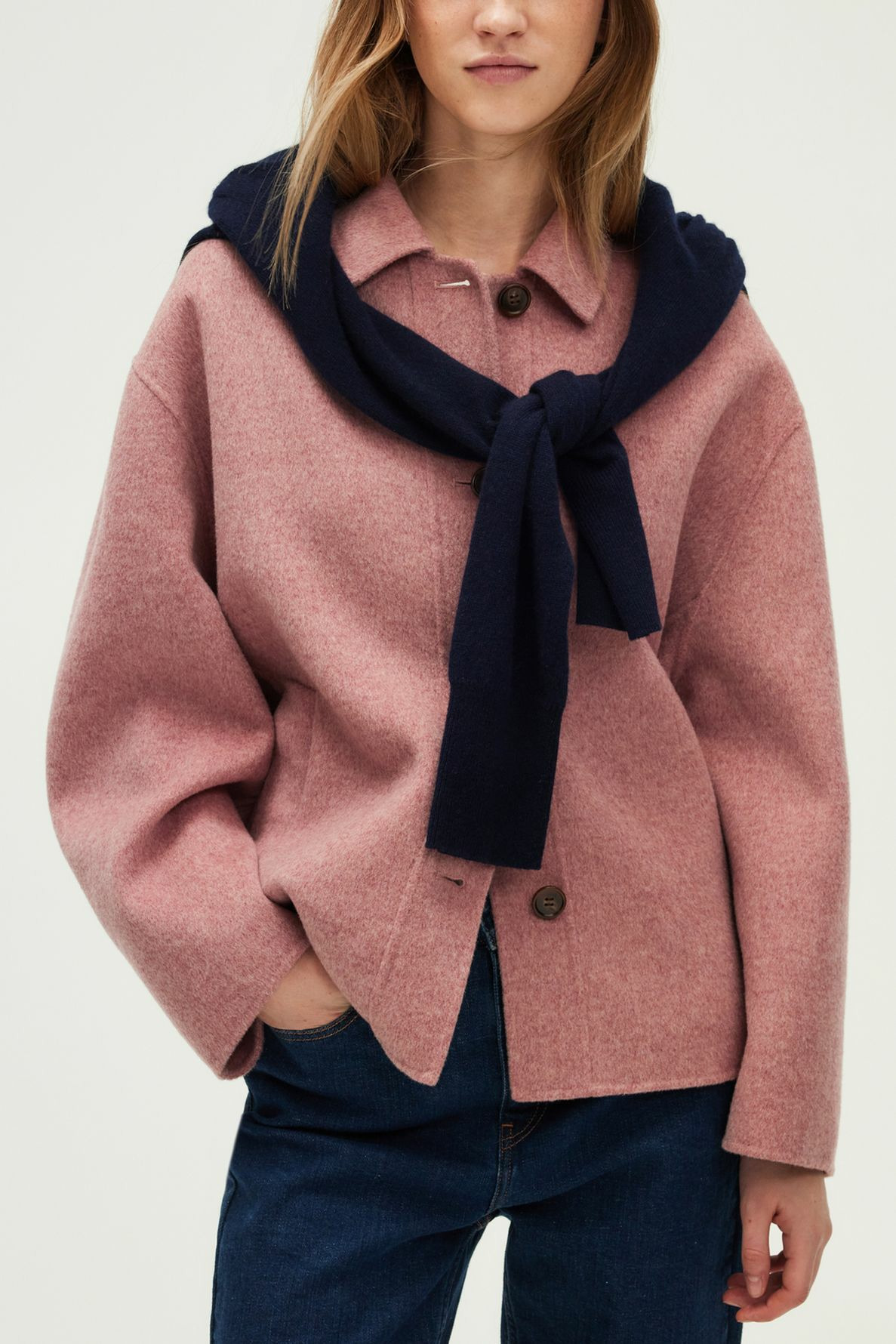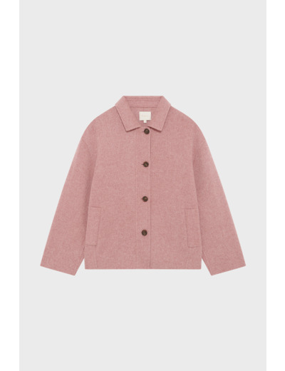 Manteau court oversize en laine mélangée double face, col chemise fermé, manches longues, emmanchure basse, poches passepoilées verticales, fermeture par boutons, coutures ton sur ton.
