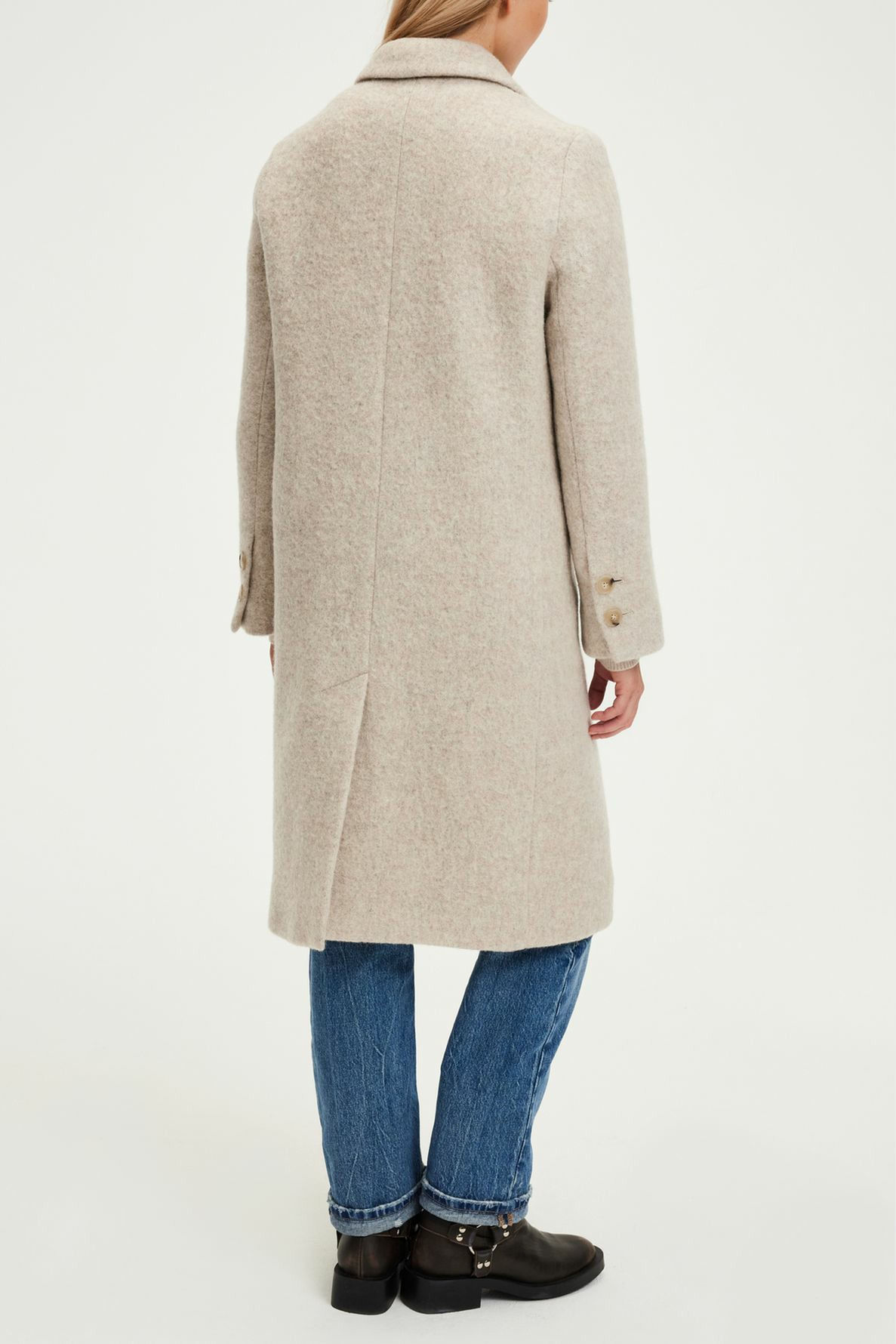 Manteau droit long en 100% laine vierge, laine unie à effet poilu et chiné. Col et emmanchure tailleur, manches longues avec poignets fermés par deux boutons ronds esprit corne. Fermeture par trois boutons ronds esprit corne. Poches passepoilées à rabat. Fente d’aisance au dos. La mannequin mesure 174 cm et porte une taille 38.