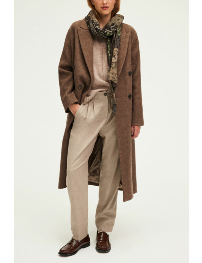 Forme droite et ample, motif à chevrons, manteau long avec emmanchure basse, col tailleur, manches longues, boutonnage croisé, fente d’aisance au bas du dos, poches passepoilées à rabat. La mannequin mesure 174 cm et porte une taille 38.