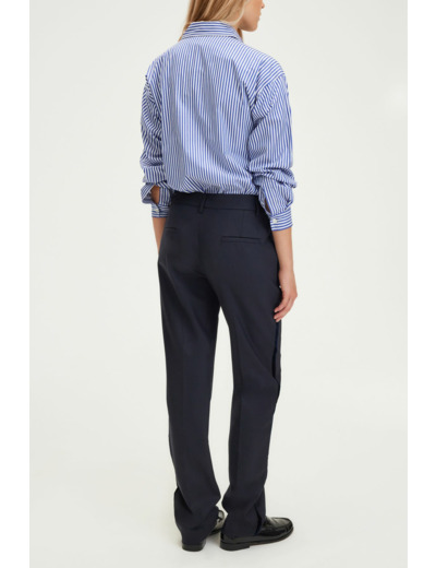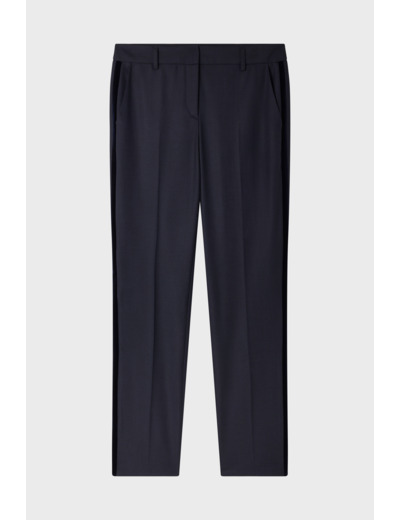 Forme droite ajustée, coupe cigarette, tissu uni en mélange laine texturé. Pantalon long avec pli le long de la jambe, ourlet invisible. Fermeture zippée sous patte, une agrafe et un bouton cachés à la taille. Poches italiennes devant, poches plates passepoilées au dos. Ceinture montée à passants. La mannequin mesure 174 cm et porte une taille 38.