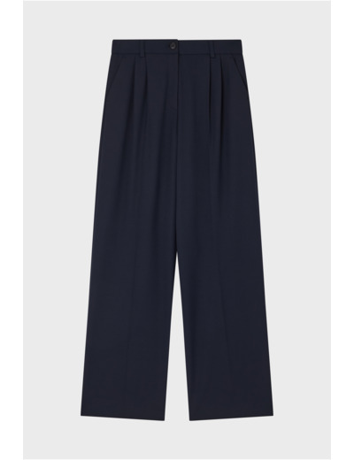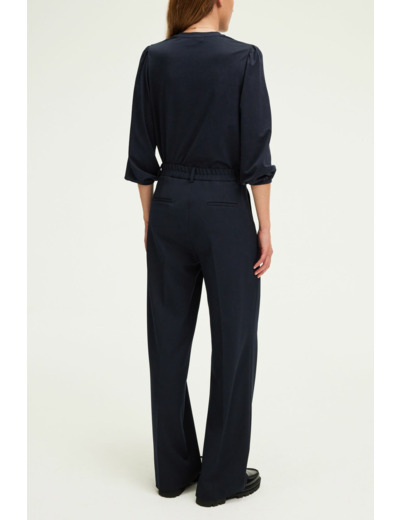 Pantalon carotte à jambes larges en tissu uni, longueur longue. Fermeture par zip sous patte et bouton, dos élastiqué. Poches italiennes devant, poches plates passepoilées au dos. Ceinture montée à passants, pinces sous la ceinture, pli le long de la jambe, ourlet invisible.