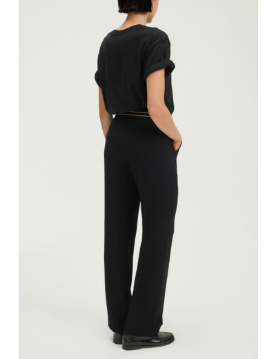 Question ? Comment entretenir ce pantalon ? Réponse. Il est recommandé de suivre les instructions de lavage indiquées sur l’étiquette pour préserver la qualité du crêpe et la tenue du liseré doré.