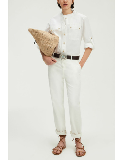 Matière : coton, lyocell, lin. Coupe droite, jambes larges. Longueur 7/8. Fermeture zip sous patte et bouton esprit corne. Poches italiennes devant, poches plates passepoilées au dos. Ceinture montée à passants. Surpiqûres style denim. Tissu uni coloris écru.