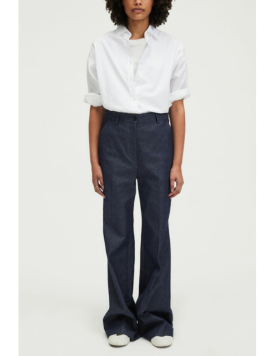 Vous bénéficiez d’un pantalon qui valorise votre silhouette grâce à sa coupe flare et sa taille haute, tout en garantissant aisance et liberté de mouvement. La fermeture discrète avec zip sous patte et double bouton assure un maintien parfait sans compromettre le style.