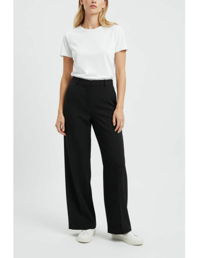 Tissu crêpe noir uni légèrement texturé. Taille haute. Coupe large et fluide. Pantalon long avec pli marqué. Fermeture par deux agrafes et zip caché sous patte. Ceinture ornée de boutons décoratifs. Poches passepoilées verticales devant et poches plates passepoilées au dos. Ourlet invisible.