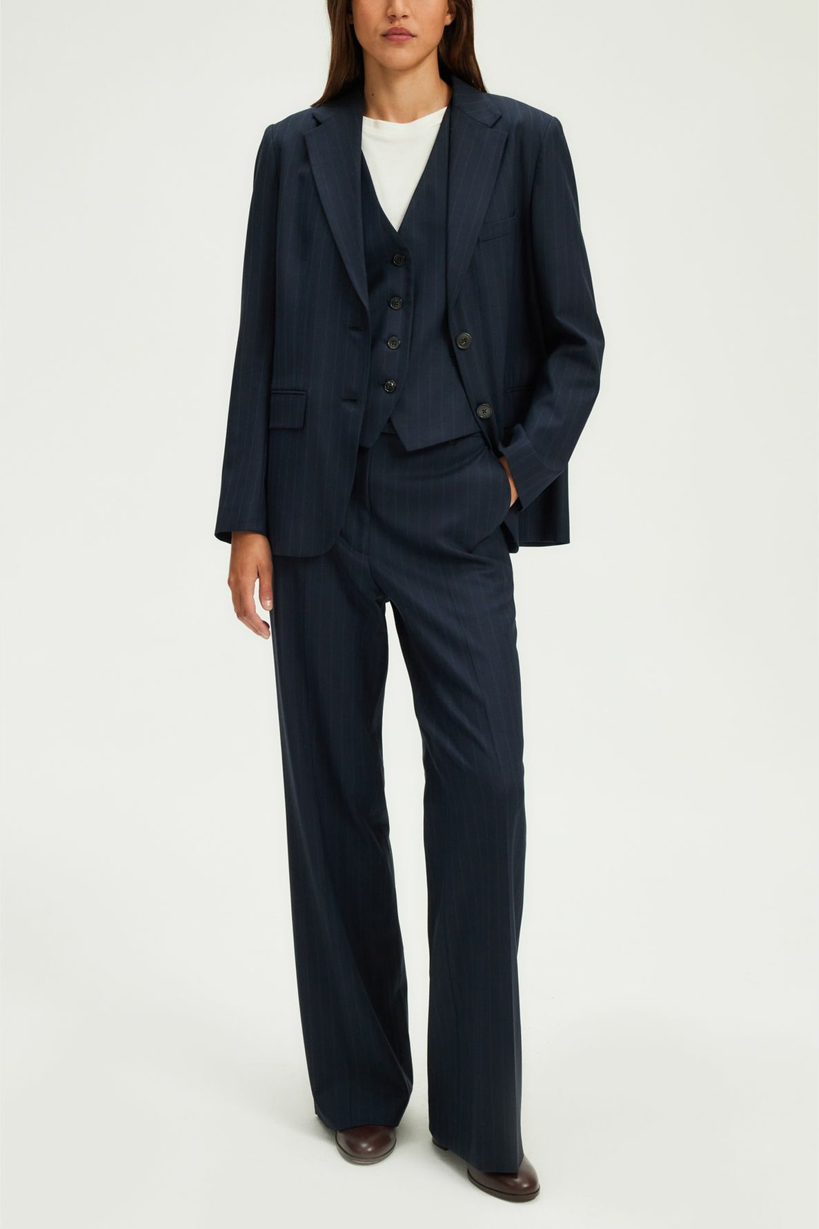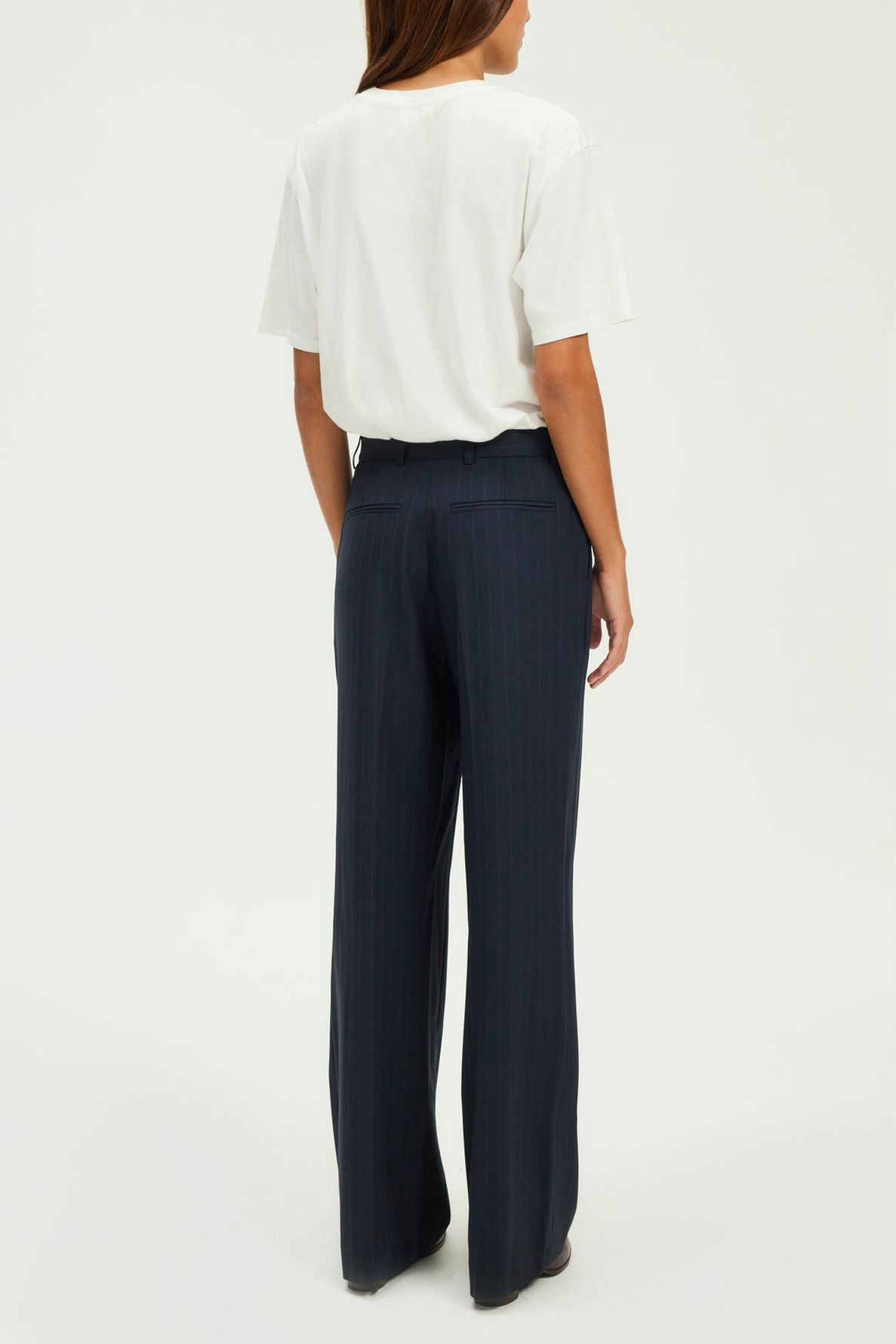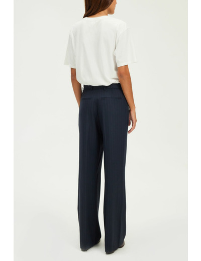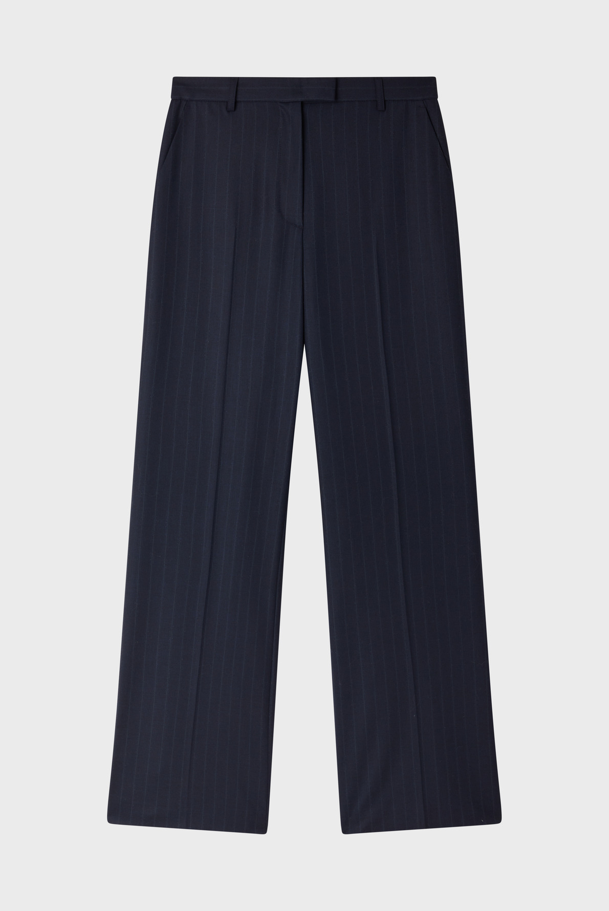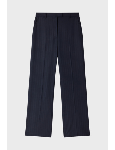 Jambes droites, coupe large, motif à fines rayures. Pantalon long en laine mélangée. Fermeture zippée sous patte, agrafe et bouton cachés à la taille. Poches italiennes devant, poches plates passepoilées au dos. Ceinture montée avec passants. Pli marqué le long de la jambe. Ourlet invisible. Taille gansée à l’intérieur.