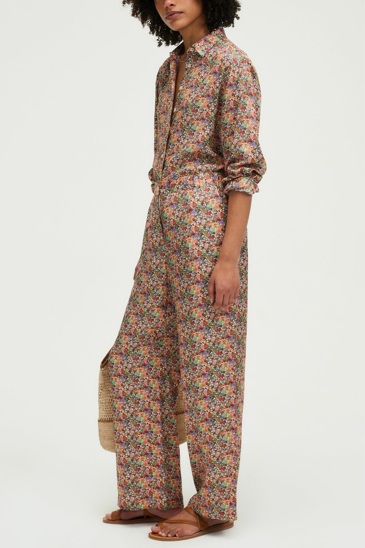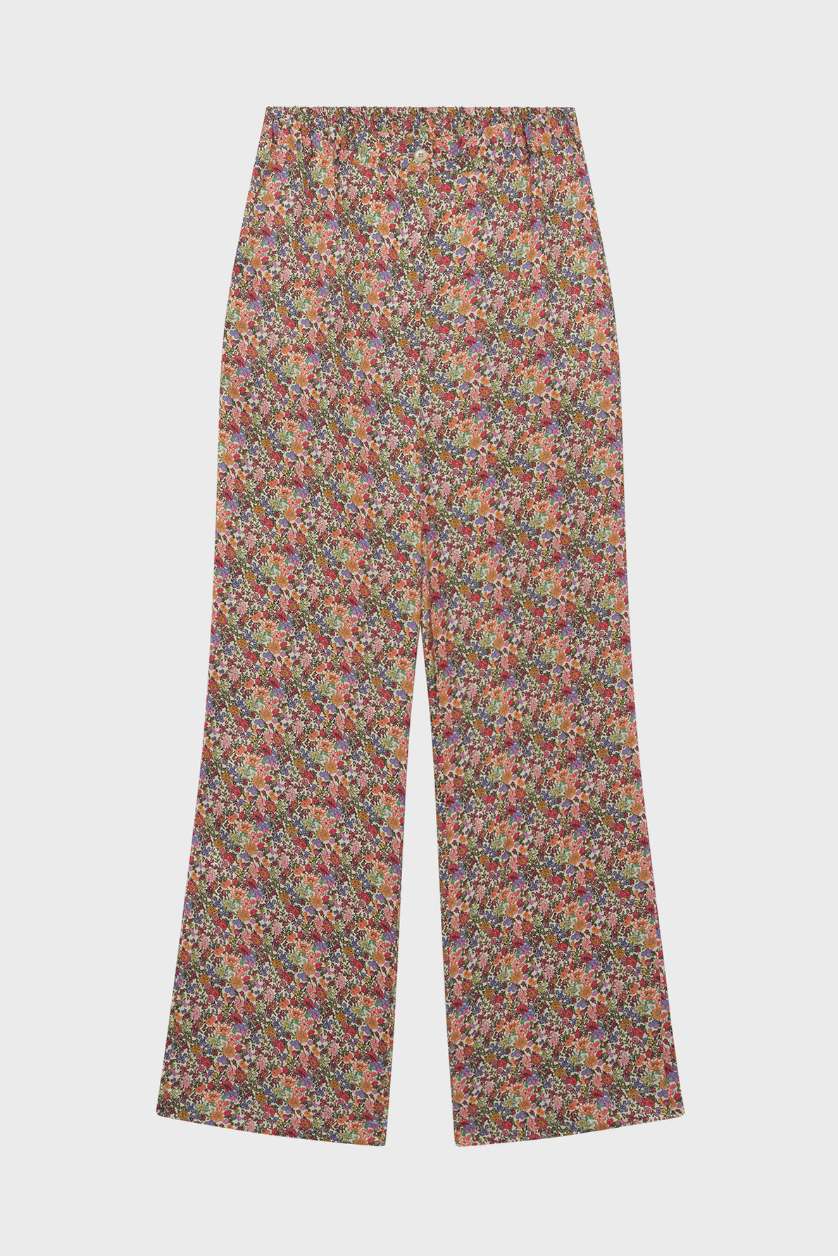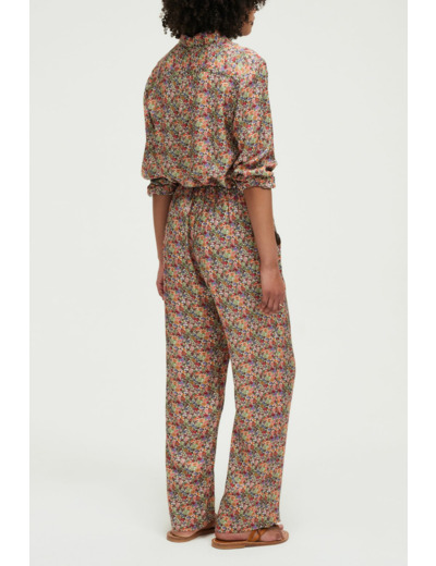 Matière douce et soyeuse, coupe large à jambes droites, taille élastiquée pour un confort optimal, motif floral discret, poches italiennes pratiques, fermeture par bouton rond et zip sous patte.