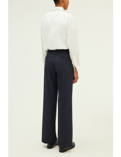 Ce pantalon allie style et fonctionnalité : sa coupe droite et large assure une aisance parfaite tout en structurant la silhouette. Les pattes de boutonnage à la ceinture permettent un ajustement optimal, tandis que les détails marins confèrent une allure intemporelle et distinguée, idéale pour un dressing moderne et élégant.
