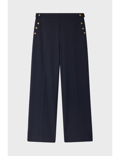 Adoptez l’élégance maritime avec ce pantalon large à pont signé Pablo, où le détail des boutons dorés gravés sublime une coupe droite et fluide. Un essentiel chic qui s’associe parfaitement à la veste assortie pour un look coordonné et raffiné.