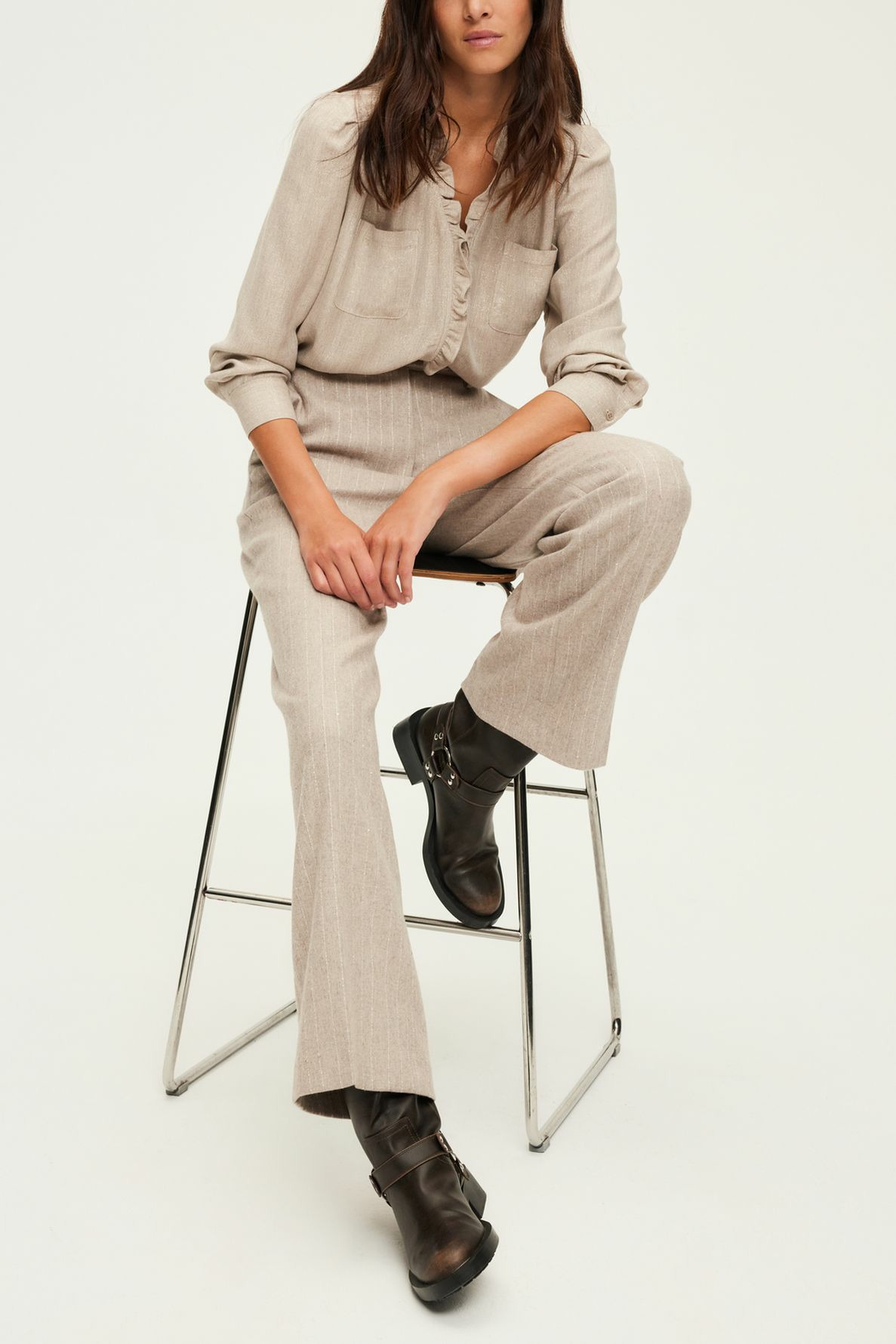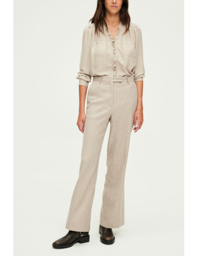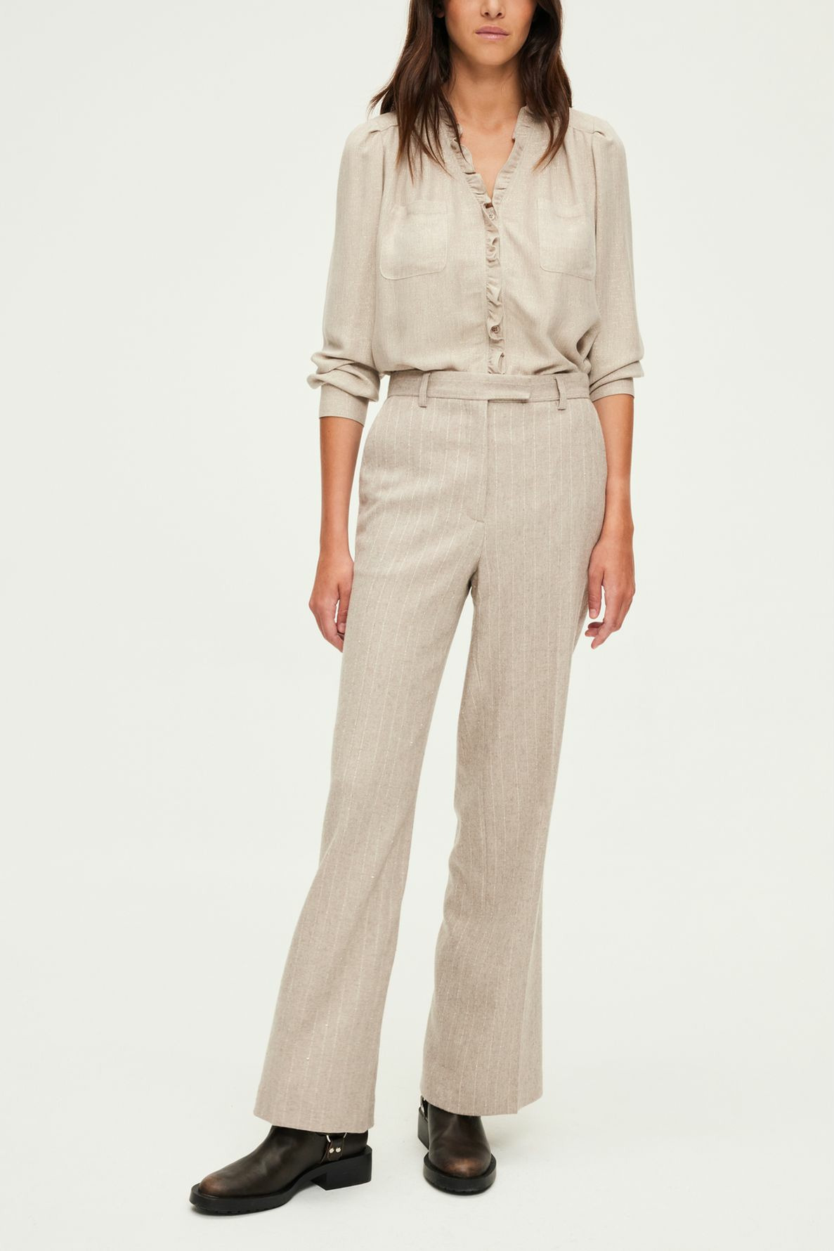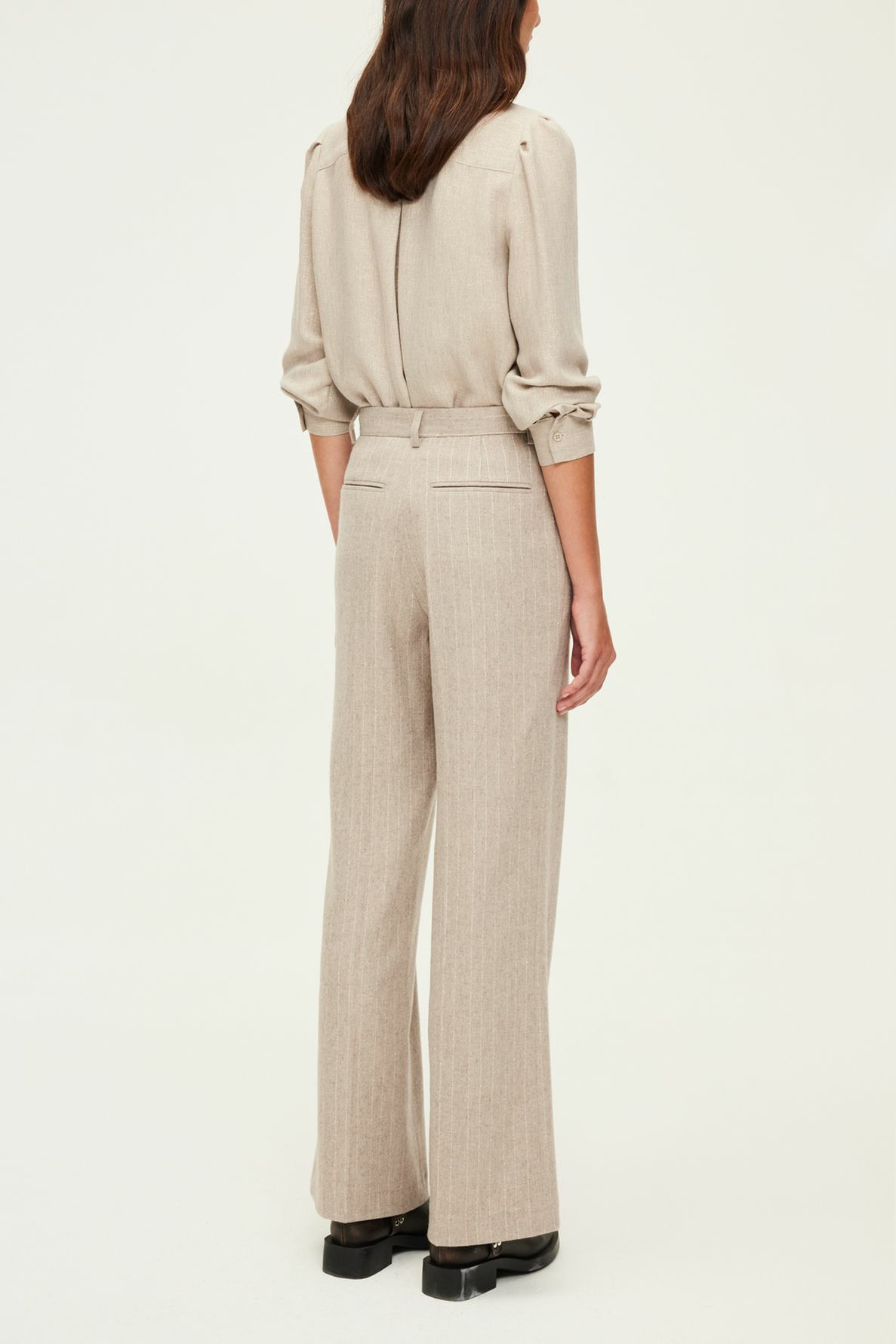 Fermeture zippée sous patte, une agrafe et un bouton cachés à la taille. Coupe large avec jambes droites. Motif à fines rayures et mini sequins en laine mélangée. Poches italiennes devant, poches plates passepoilées au dos. Ceinture montée à passants, pli le long de la jambe, ourlet invisible. La mannequin mesure 180 cm et porte une taille 38.