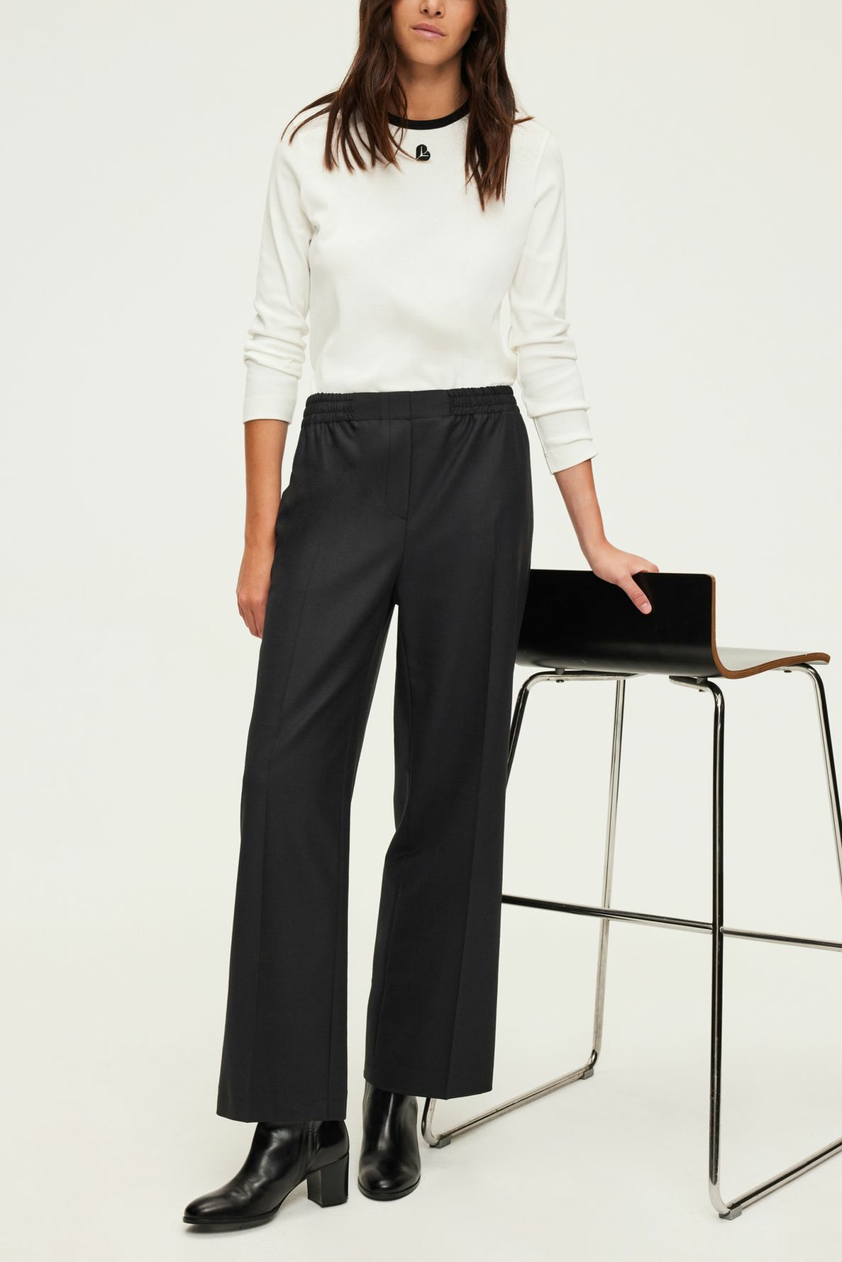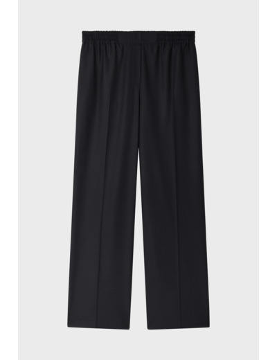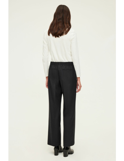 Pantalon long en mélange de laine uni, coupe droite large, taille élastiquée, poches italiennes devant, poches plates passepoilées au dos, pli le long de la jambe, ourlet invisible. La mannequin mesure 180 cm et porte une taille 38.