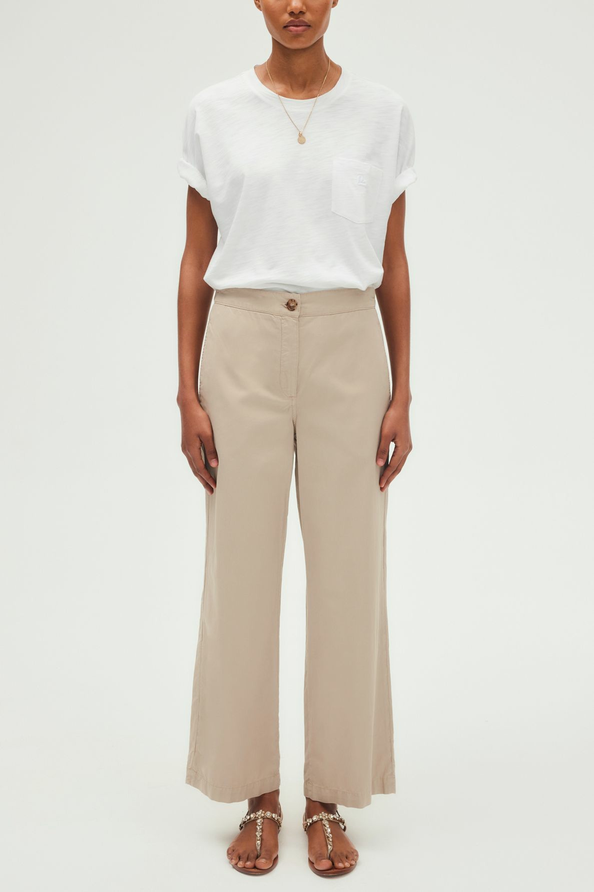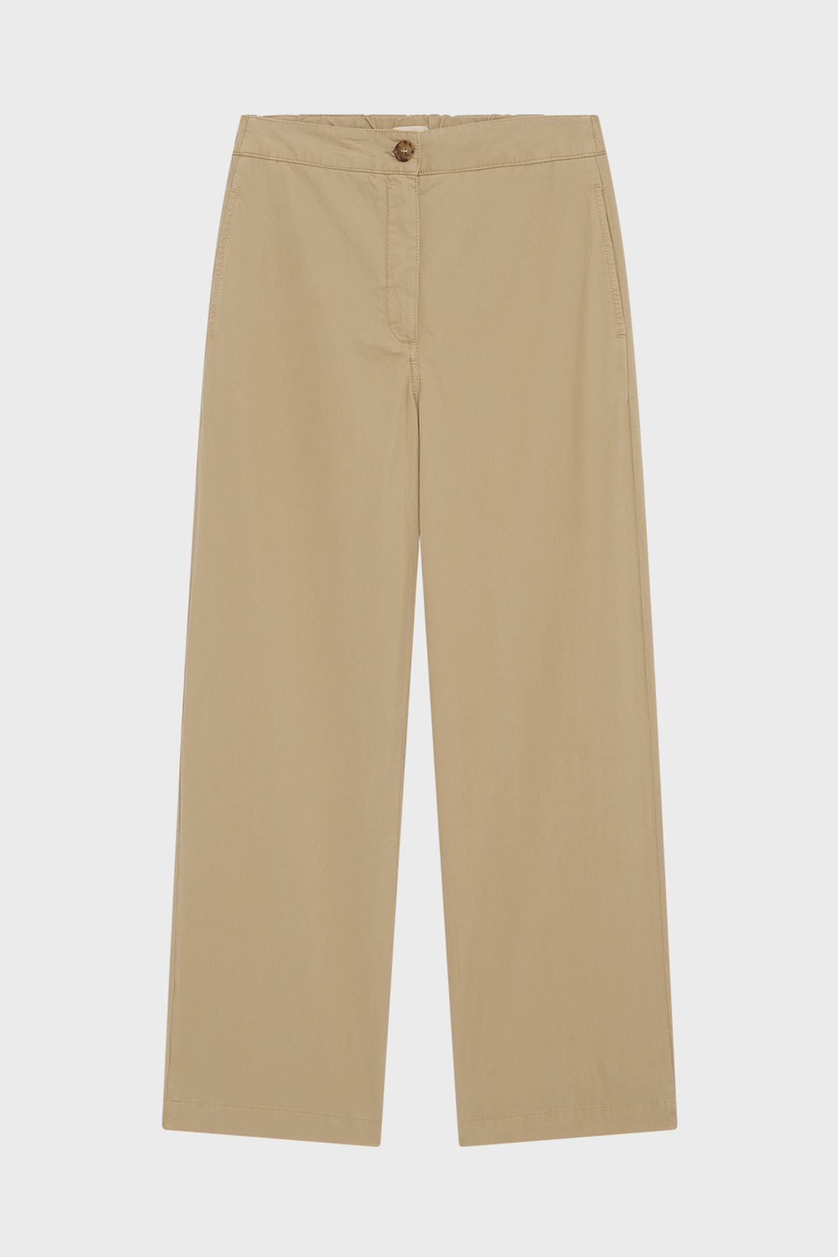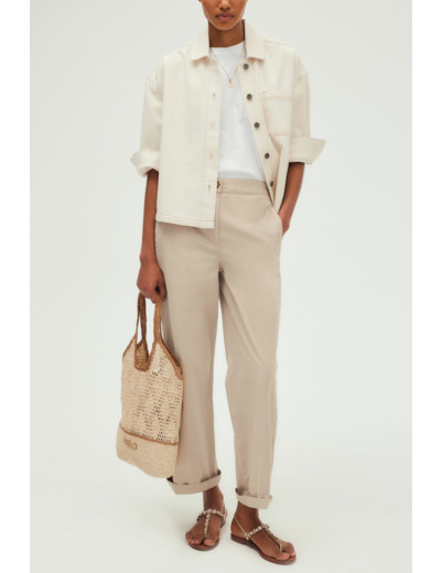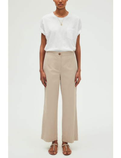Pantalon long à jambes droites, tissu uni beige, mélange coton et lyocell doux et respirant. Fermeture avec zip sous patte, bouton caché à la taille et bouton rond apparent. Dos élastiqué pour plus de confort. Poches italiennes devant, poches plates passepoilées au dos. Coupe large.