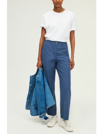 Pantalon long à jambes droites, confectionné en coton et lyocell pour un toucher doux et une excellente respirabilité. Fermeture avec zip sous patte, bouton caché à la taille et bouton rond apparent. Dos élastiqué pour un confort ajusté. Poches italiennes devant et poches plates passepoilées au dos. Couleur bleu indigo uni.