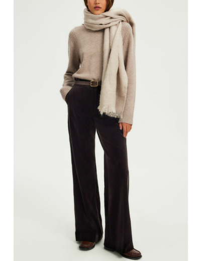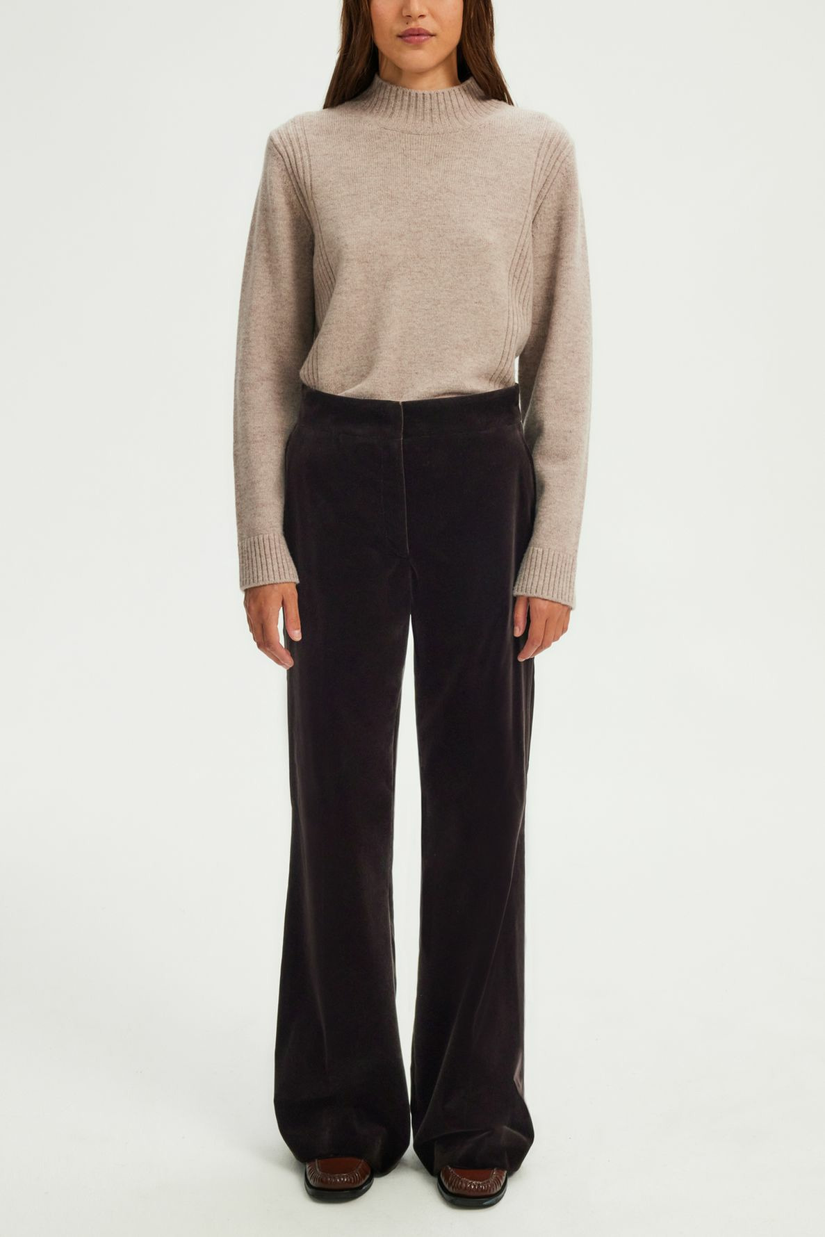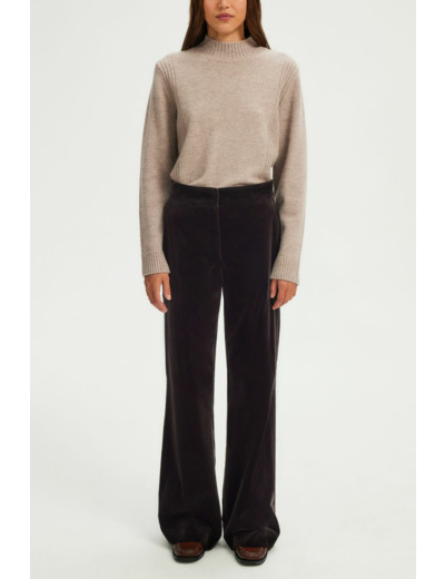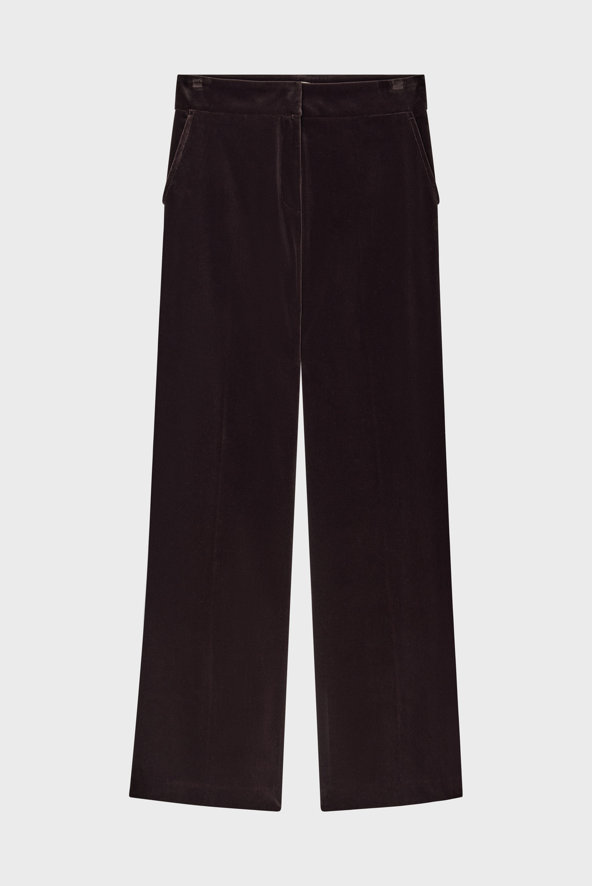 Ce pantalon est réalisé en velours uni, avec un ourlet invisible pour une finition soignée. La taille est ajustée par une fermeture discrète comprenant un zip, une agrafe et un bouton. La mannequin mesure 176 cm et porte une taille 38.
