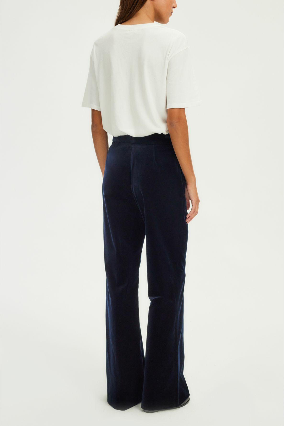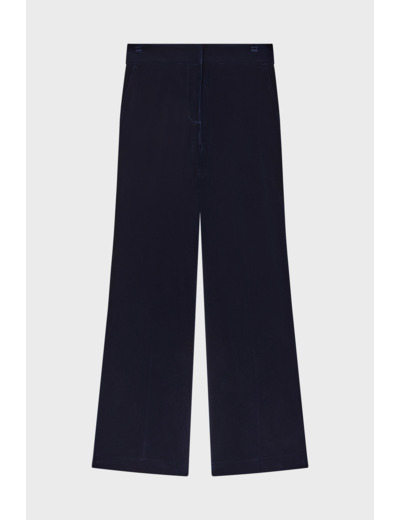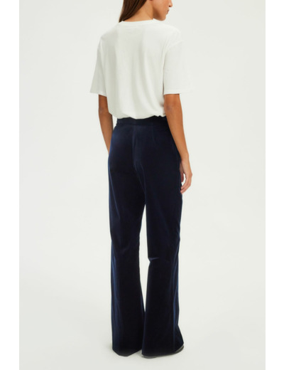 Adoptez l’élégance intemporelle avec ce pantalon large en velours lisse marine, parfait pour un look sophistiqué et décontracté. Associez-le à la veste assortie pour une silhouette chic et affirmée.