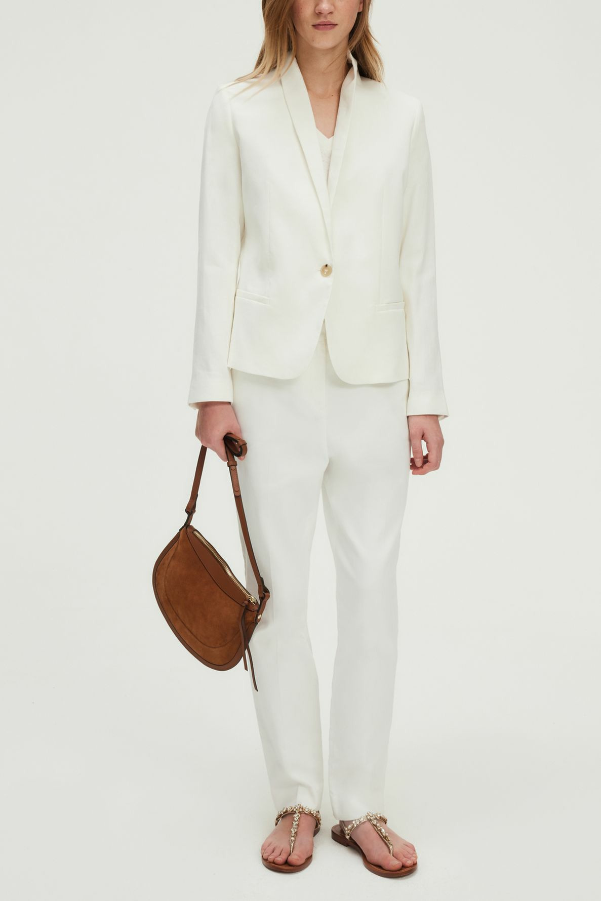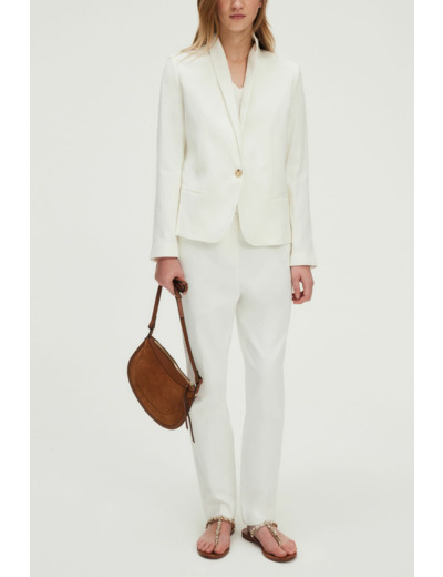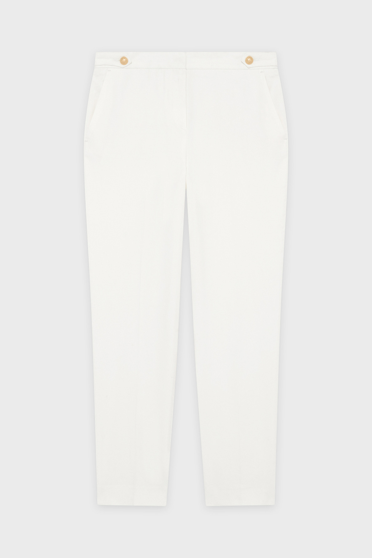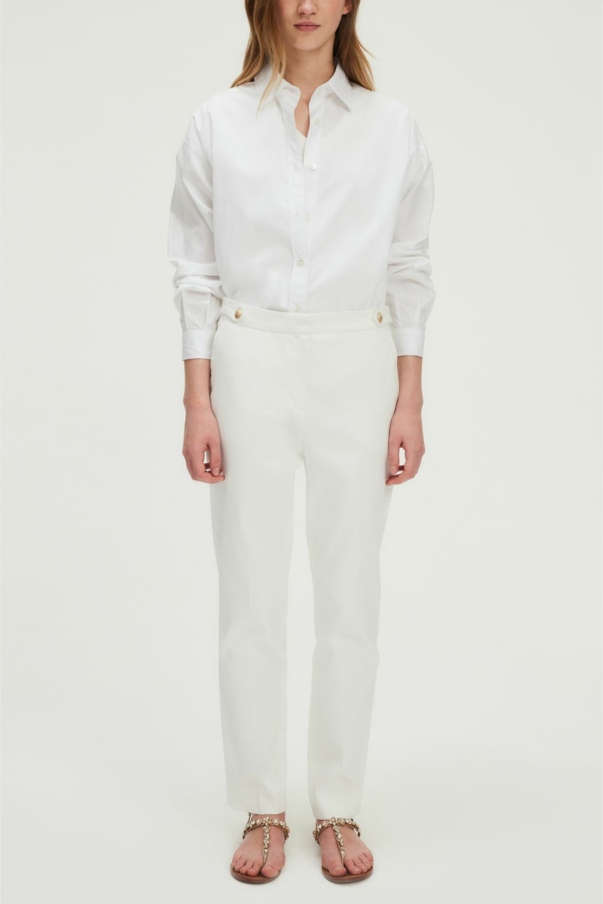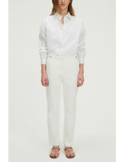Pantalon slim 7/8 en coton blanc avec ceinture à double bouton doré gravé. Jambes droites, coupe slim, matière stretch. Fermeture zippée sous patte avec agrafe et bouton cachés. Poches italiennes devant, poches plates passepoilées au dos. Pli le long de la jambe, ourlet invisible, pattes de boutonnage à la ceinture.