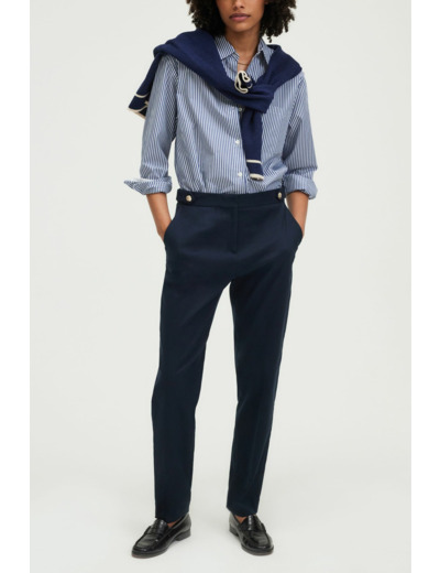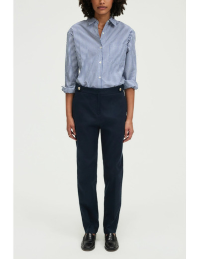 Pantalon slim 7/8 en coton uni bleu marine. Forme droite avec pli le long de la jambe. Fermeture zippée sous patte, agrafe et bouton caché à la taille. Ceinture ornée de boutons dorés gravés et pattes de boutonnage. Matière stretch pour plus de confort. Poches italiennes devant, poches plates passepoilées au dos. Ourlet invisible.