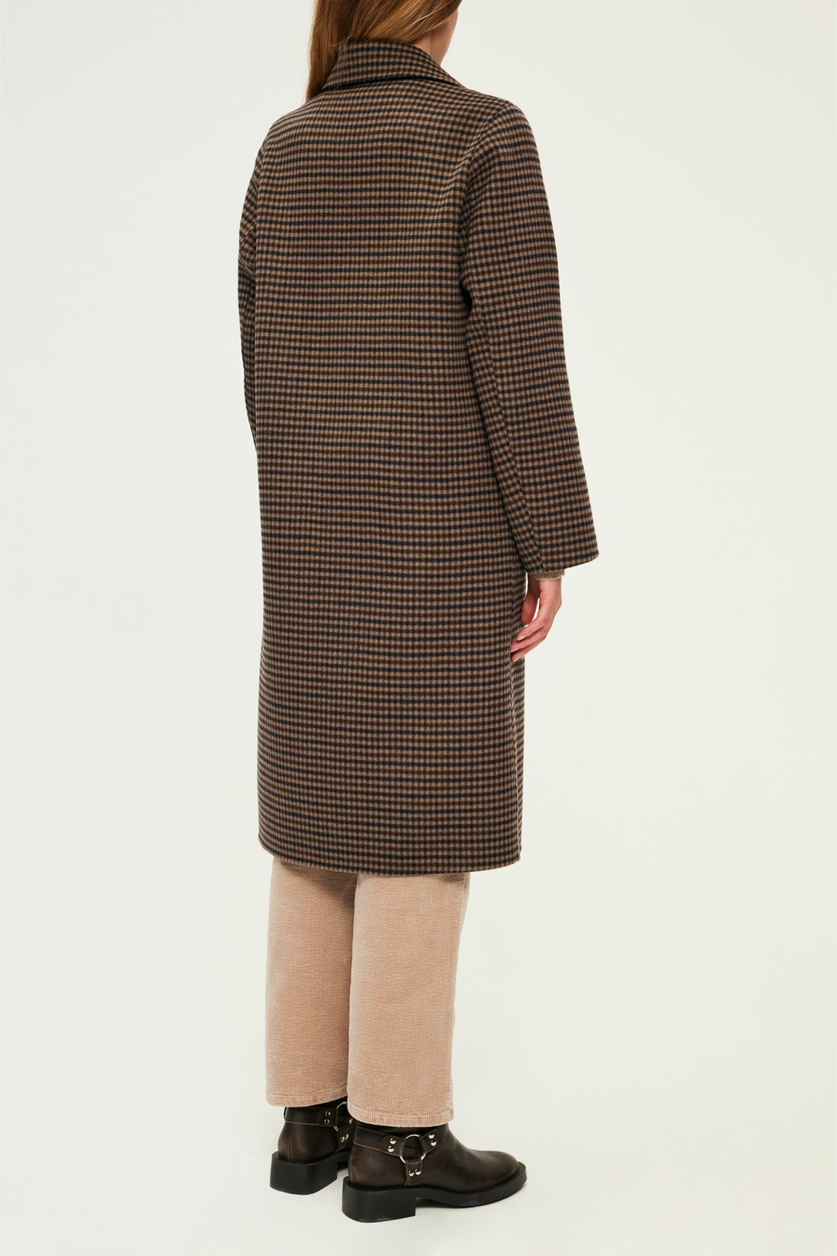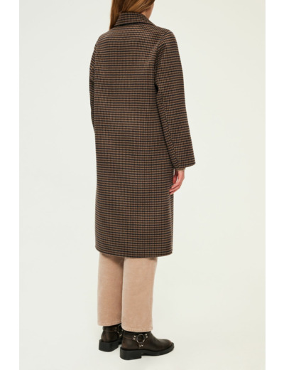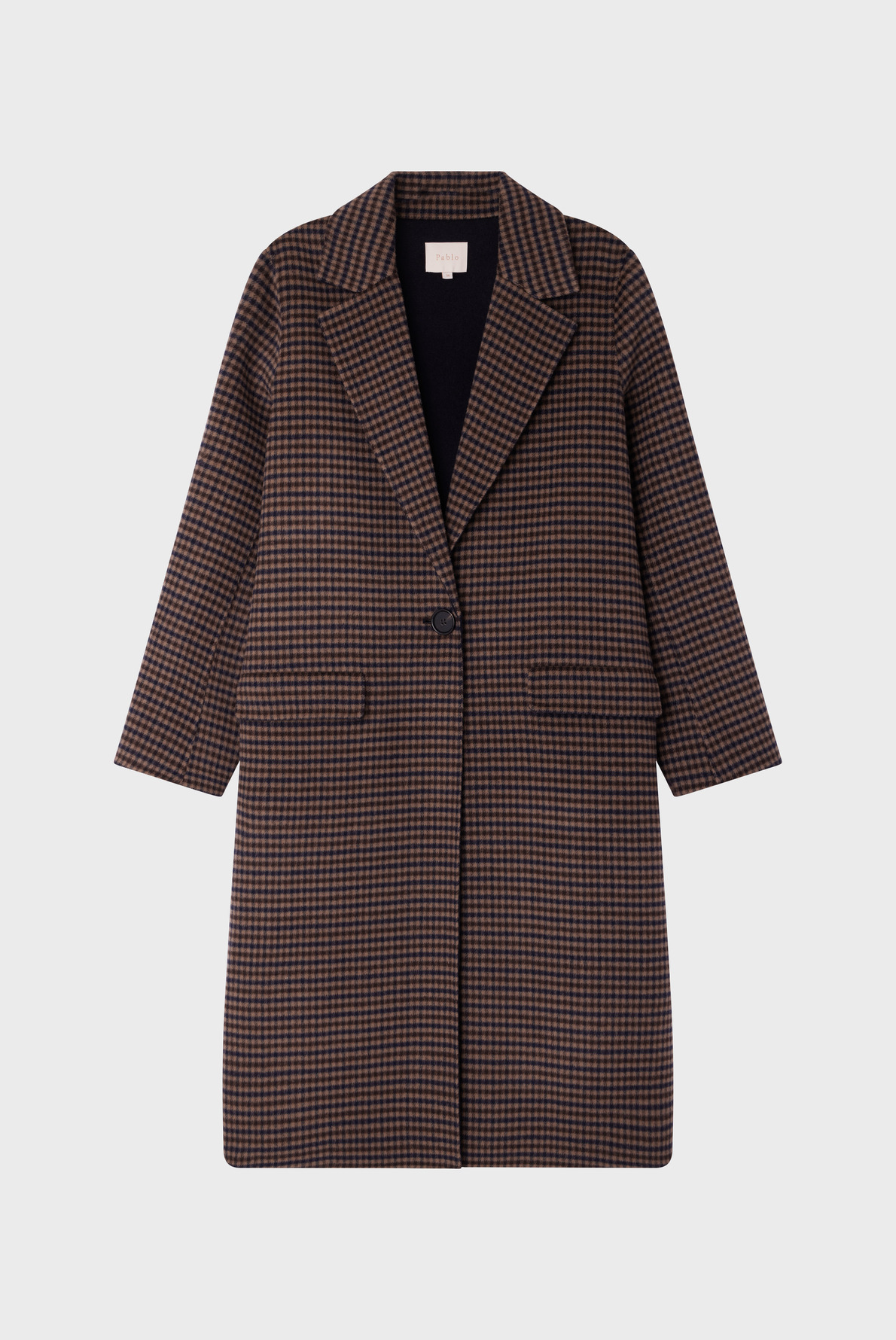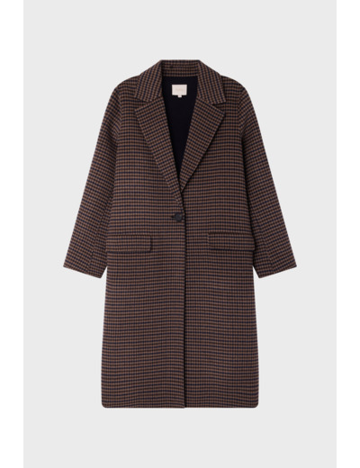 Forme droite, motif à carreaux, manteau mi-long, emmanchure classique, col tailleur, manches longues, fermeture par un bouton rond. La mannequin mesure 174 cm et porte une taille unique. 100% laine double-face, douce à l’intérieur comme à l’extérieur.