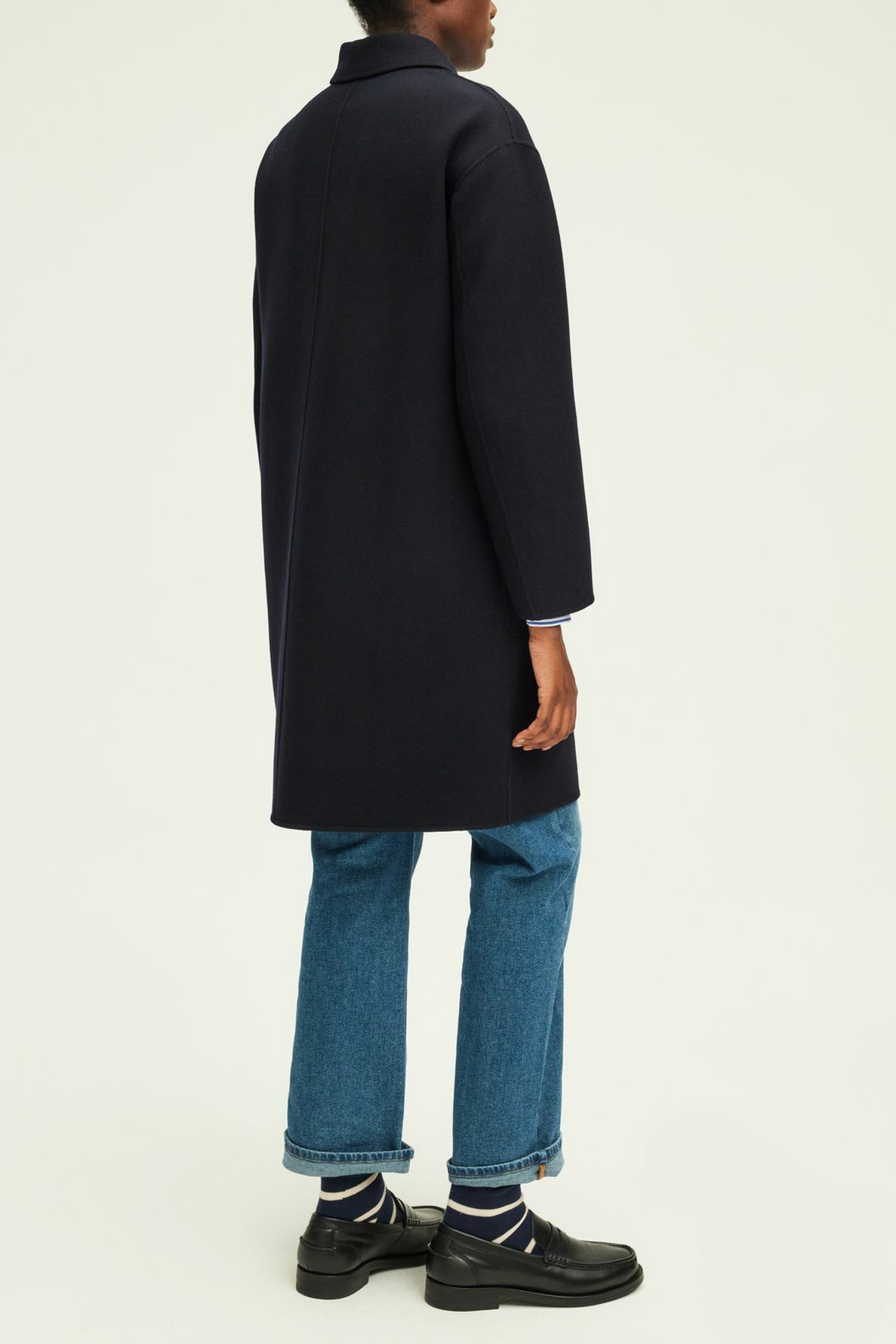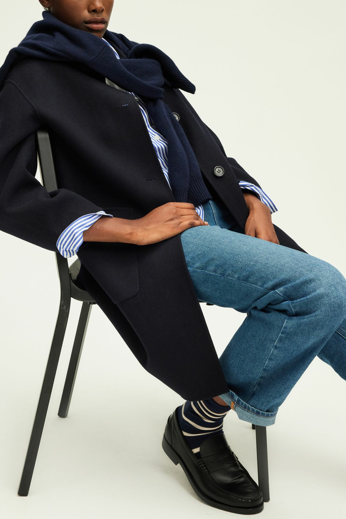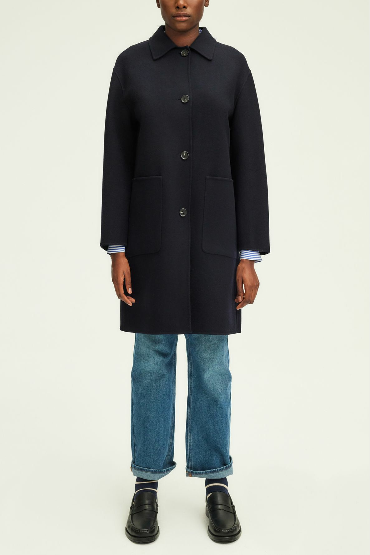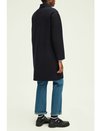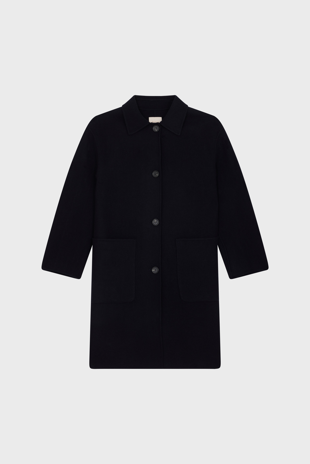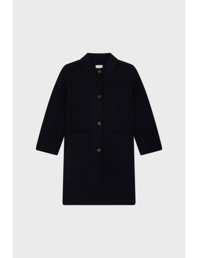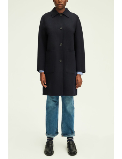 Matière : laine mélangée unie, double face. Coupe droite légèrement trapèze. Longueur mi-longue. Col chemise. Manches longues. Emmanchure basse. Fermeture par boutons. Grandes poches plates. Finitions double face. La mannequin mesure 177 cm et porte une taille 2.