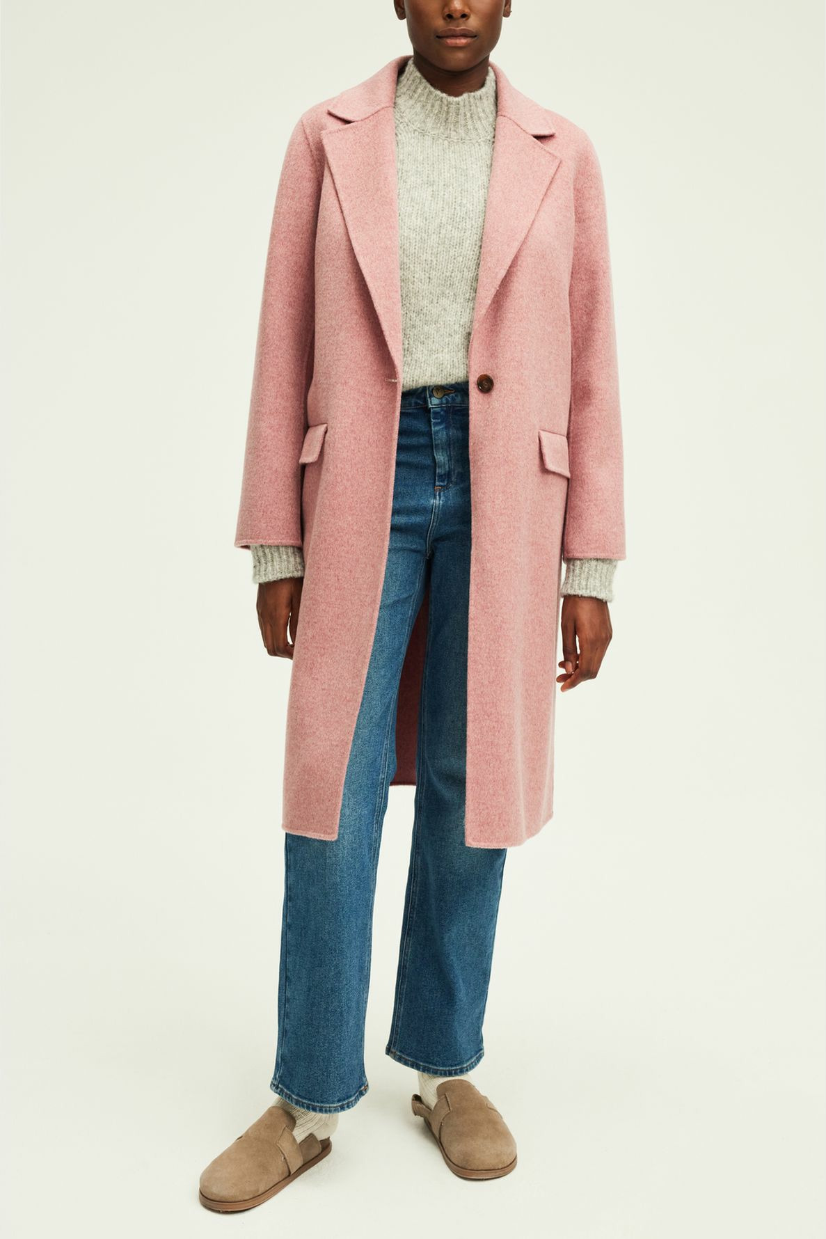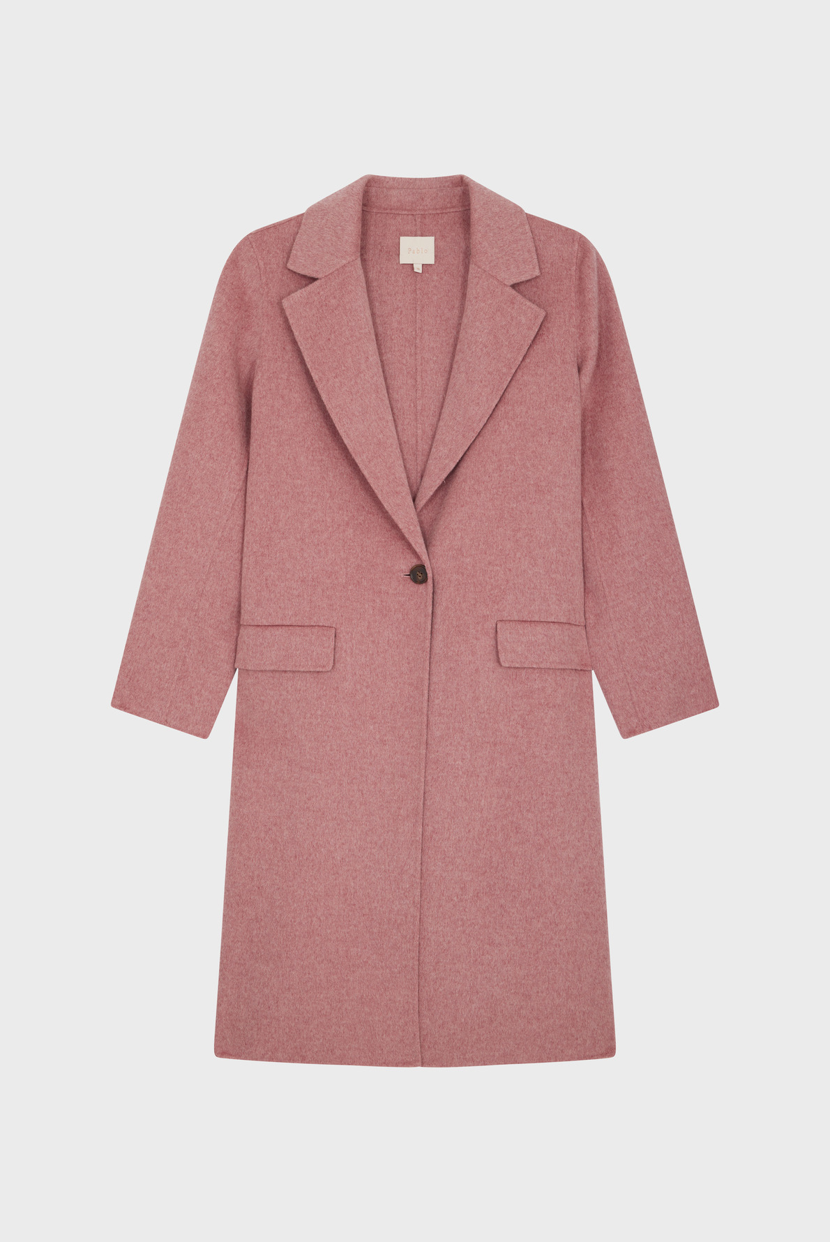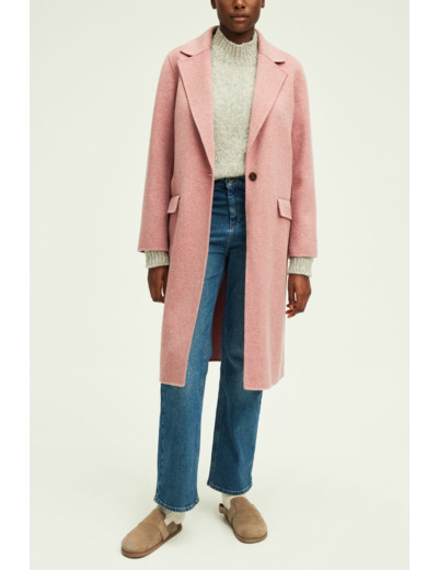 100 % laine double face, manteau long avec col tailleur, manches longues, emmanchure classique, fermeture par bouton rond, fente d’aisance au dos. Laine unie à l’aspect chiné. La mannequin mesure 177 cm et porte une taille 38.