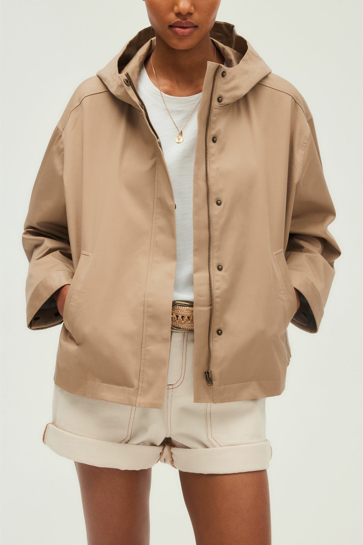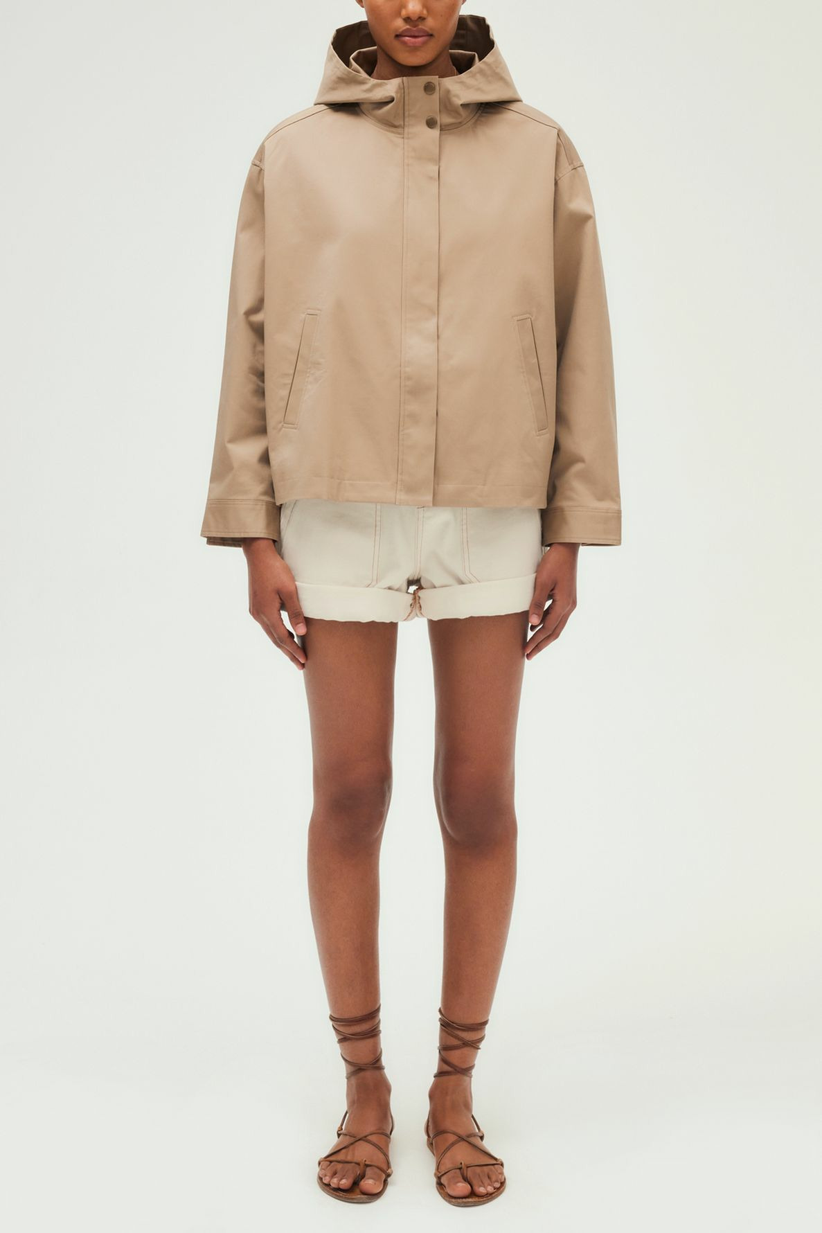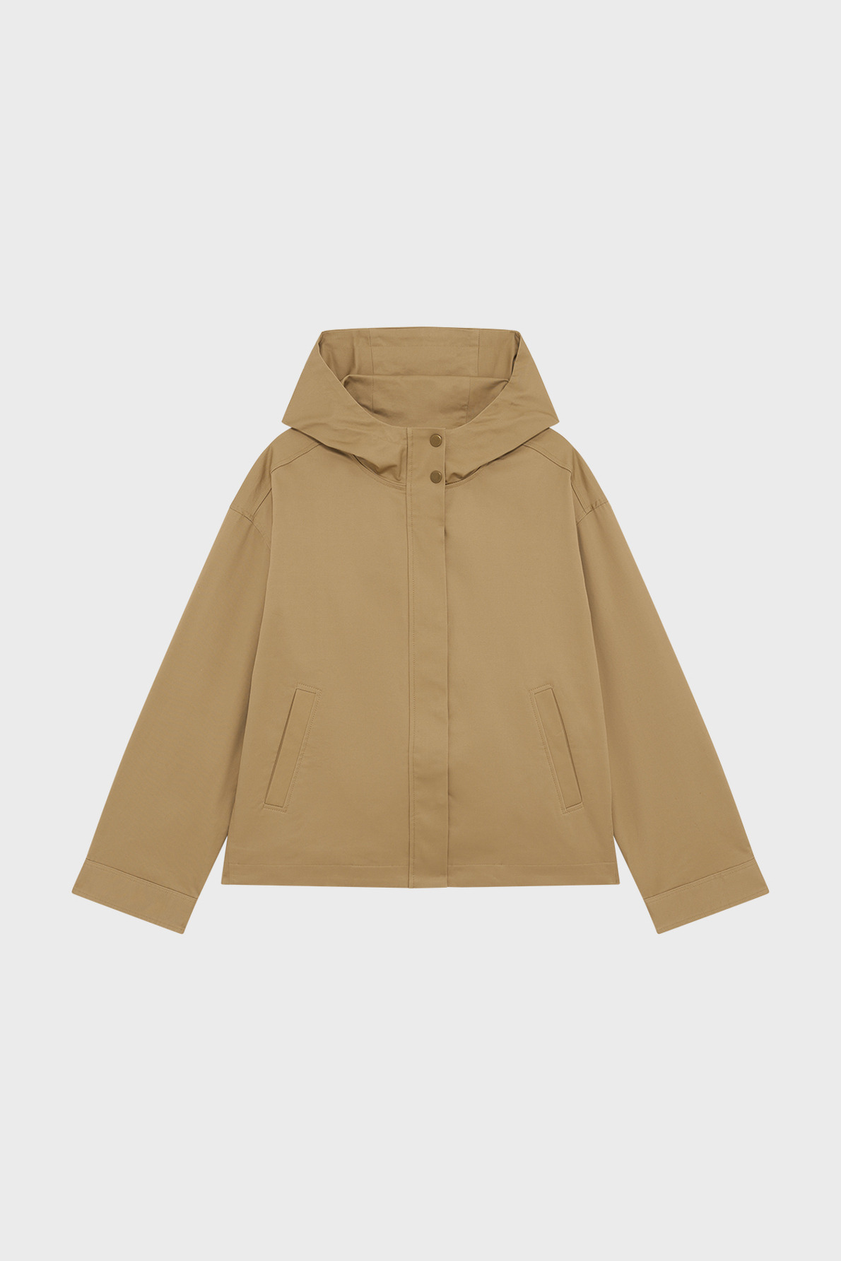 Fabriquée en coton uni, cette parka courte présente une forme droite, un col montant à capuche fermée par boutons, des manches longues avec poignets boutonnés, une fermeture zippée complétée par des boutons pression sous patte, ainsi que deux poches passepoilées verticales.