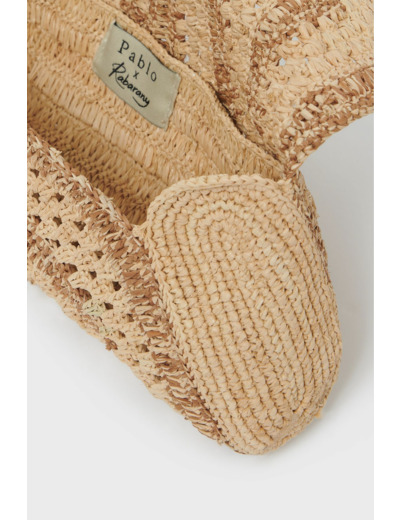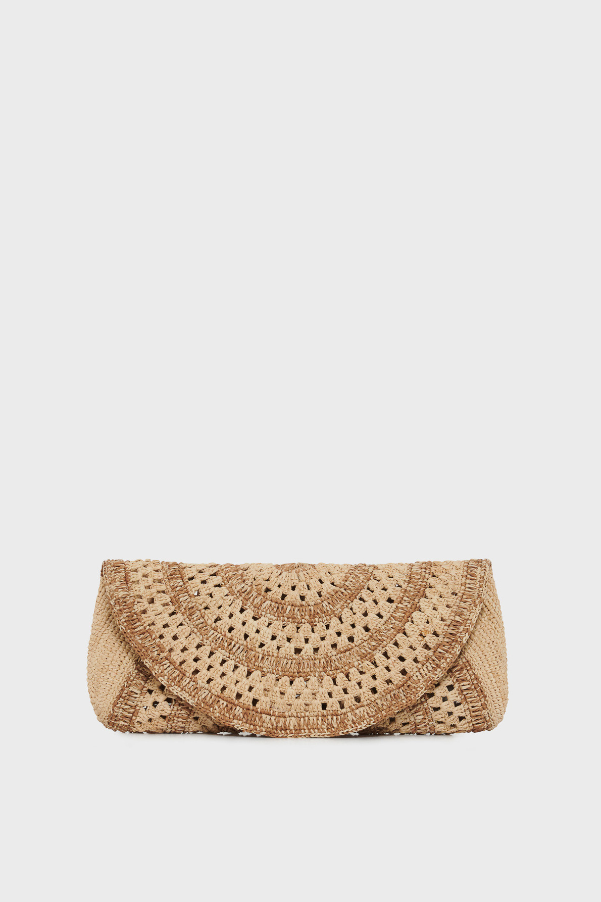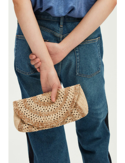 Dimensions : longueur 27 cm, hauteur 12 cm, profondeur 3 cm. Matière : raphia naturel crocheté à la main. Fermeture : top magnétique sous rabat. Intérieur : poche plaquée.