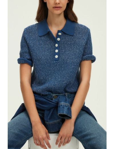 Matière : mélange coton et lin avec élasticité intégrée. Coupe droite, longueur standard. Motif bleu et blanc chiné. Col polo avec encolure boutonnée. Manches courtes. Emmanchure classique. Finitions bord-côtes unies.