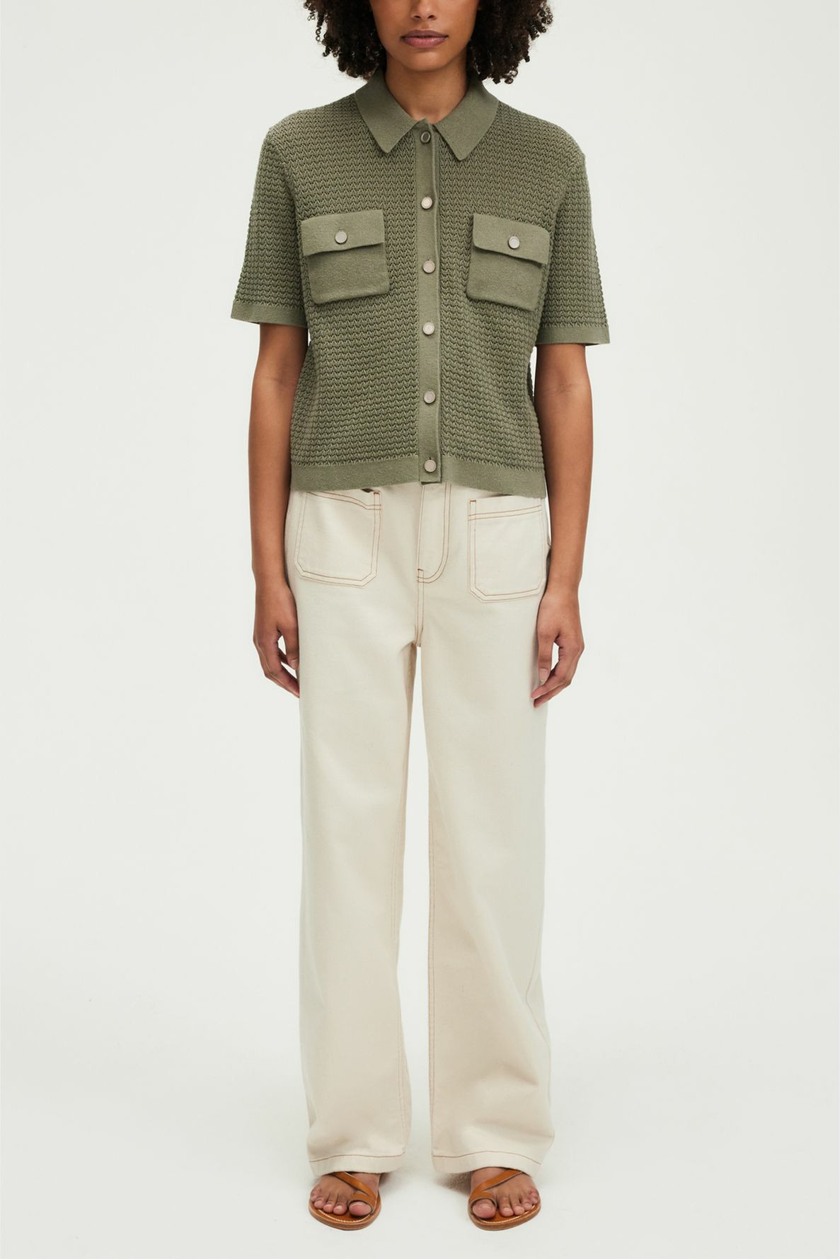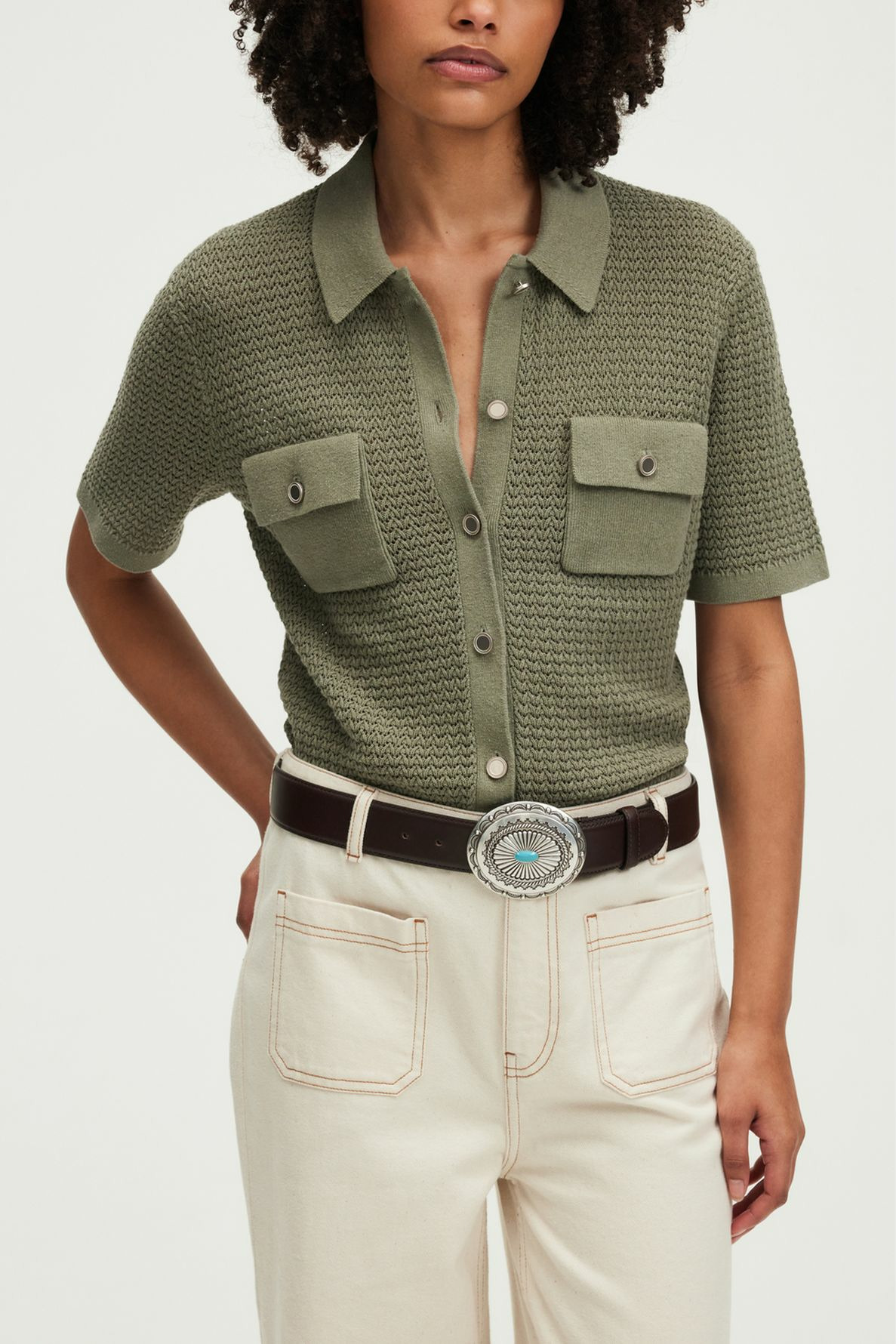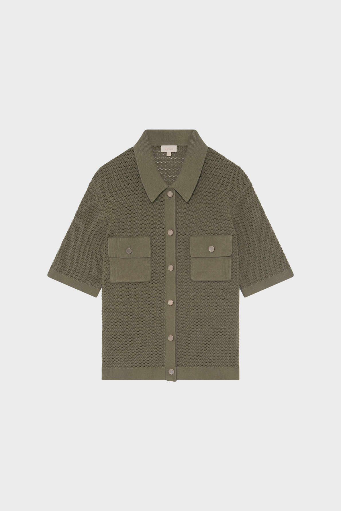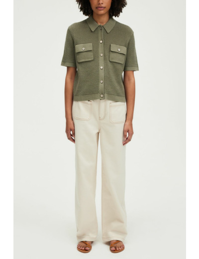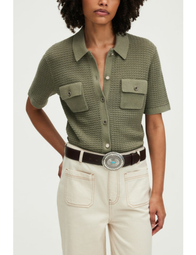 Forme droite, motif crochet, maille ajourée, col polo, manches courtes, polo boutonné, poches à rabat avec boutons fantaisie à la poitrine, longueur standard.