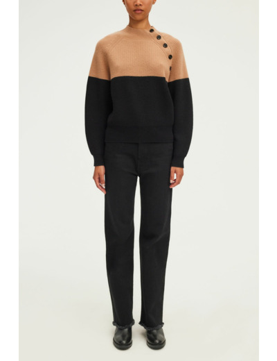 100% laine, forme droite, pull court, emmanchure raglan, col montant, manches longues, épaule gauche fermée par boutons ronds, finitions bords-côtes. La mannequin mesure 180 cm et porte une taille 2.