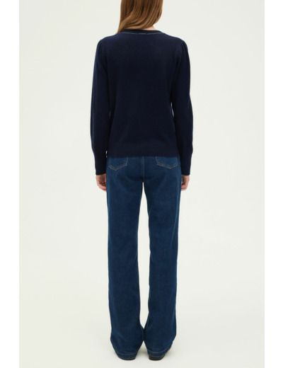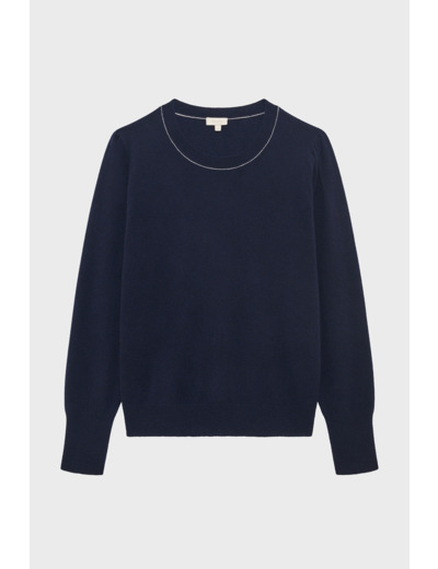 Pull en 100 % cachemire uni, col rond avec fil contrasté, forme droite, épaules légèrement froncées, manches longues, longueur standard, finitions bord-côtes.