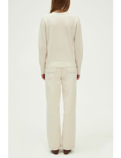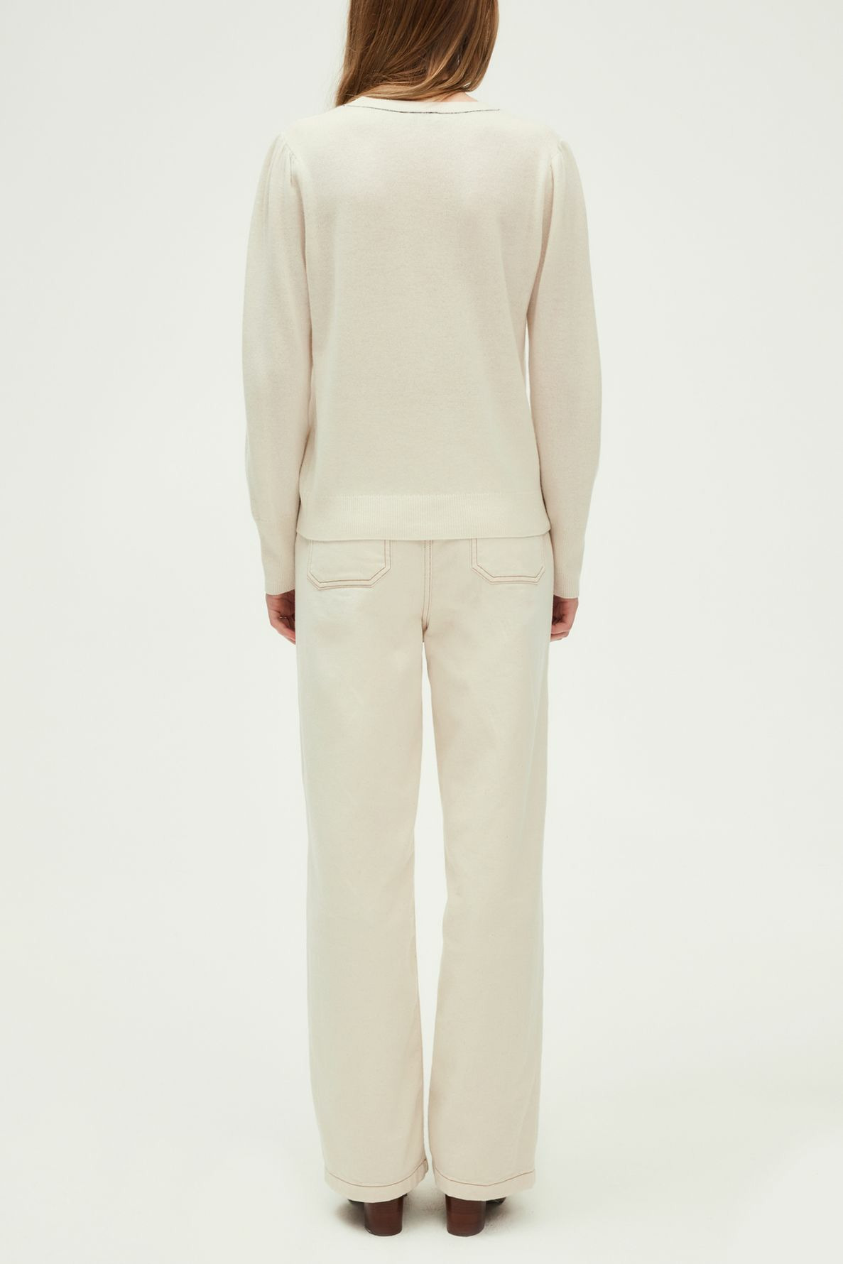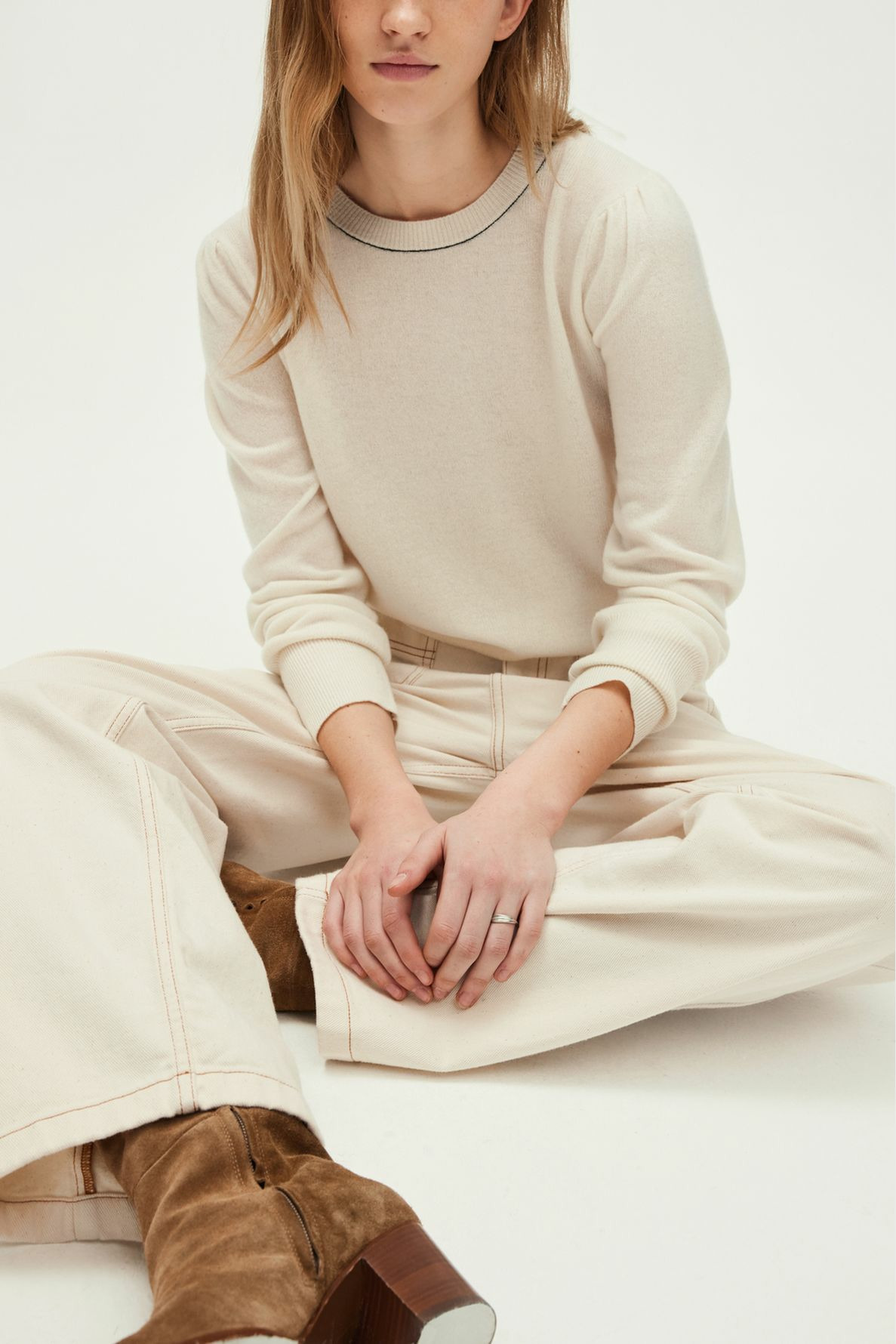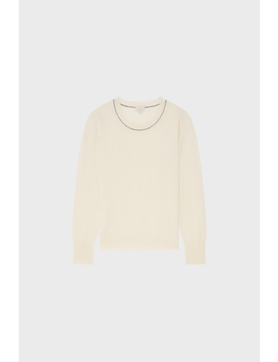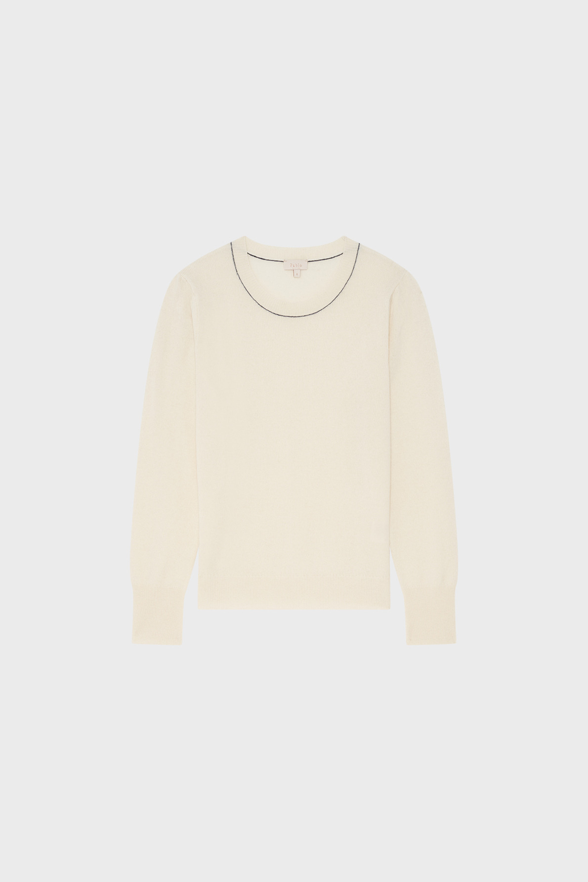 Pull en 100 % cachemire uni, col rond avec fil contrasté, forme droite, épaules légèrement froncées, manches longues, longueur standard, finitions bord-côtes.