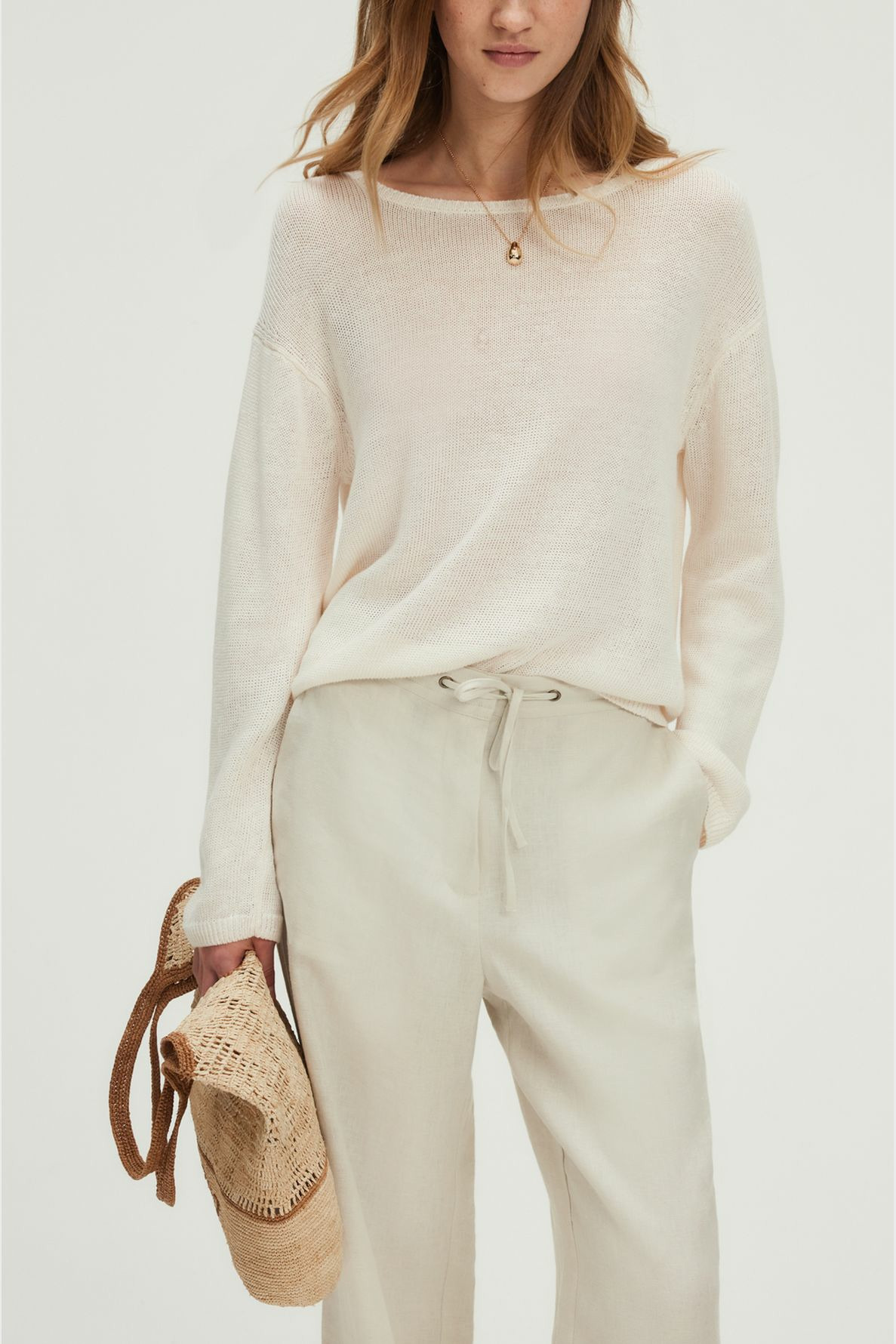 Confectionné en lin uni, ce pull allie légèreté et respirabilité pour un confort optimal même lors des journées les plus chaudes. Les manches longues et les finitions bord-côtes apportent une touche de structure tout en garantissant une tenue impeccable au fil du temps. Sa longueur standard facilite le port en superposition ou seul, selon vos envies.