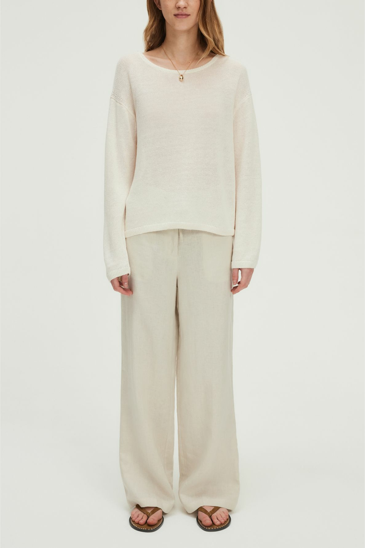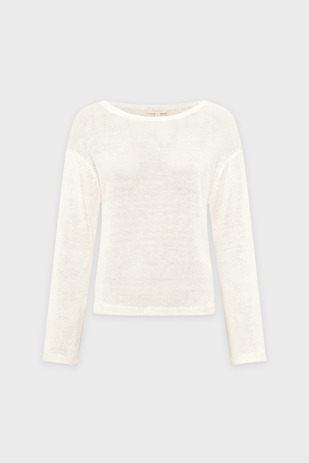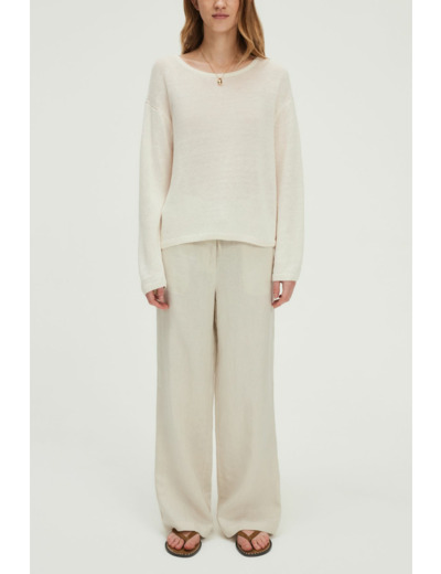 100 % lin, forme droite, col rond, manches longues, finitions bord-côtes, longueur standard.