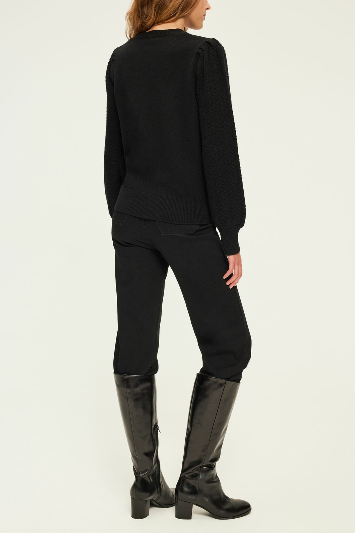 Pull uni en laine 100 % avec manches longues aux motifs ajourés en chevrons. Forme droite, longueur standard, col rond. Bas de manches resserrés par un large bord-côtes. Épaules froncées pour un effet volume maîtrisé. Jeu de maille en V à l’encolure et finitions bord-côtes pour une tenue soignée.