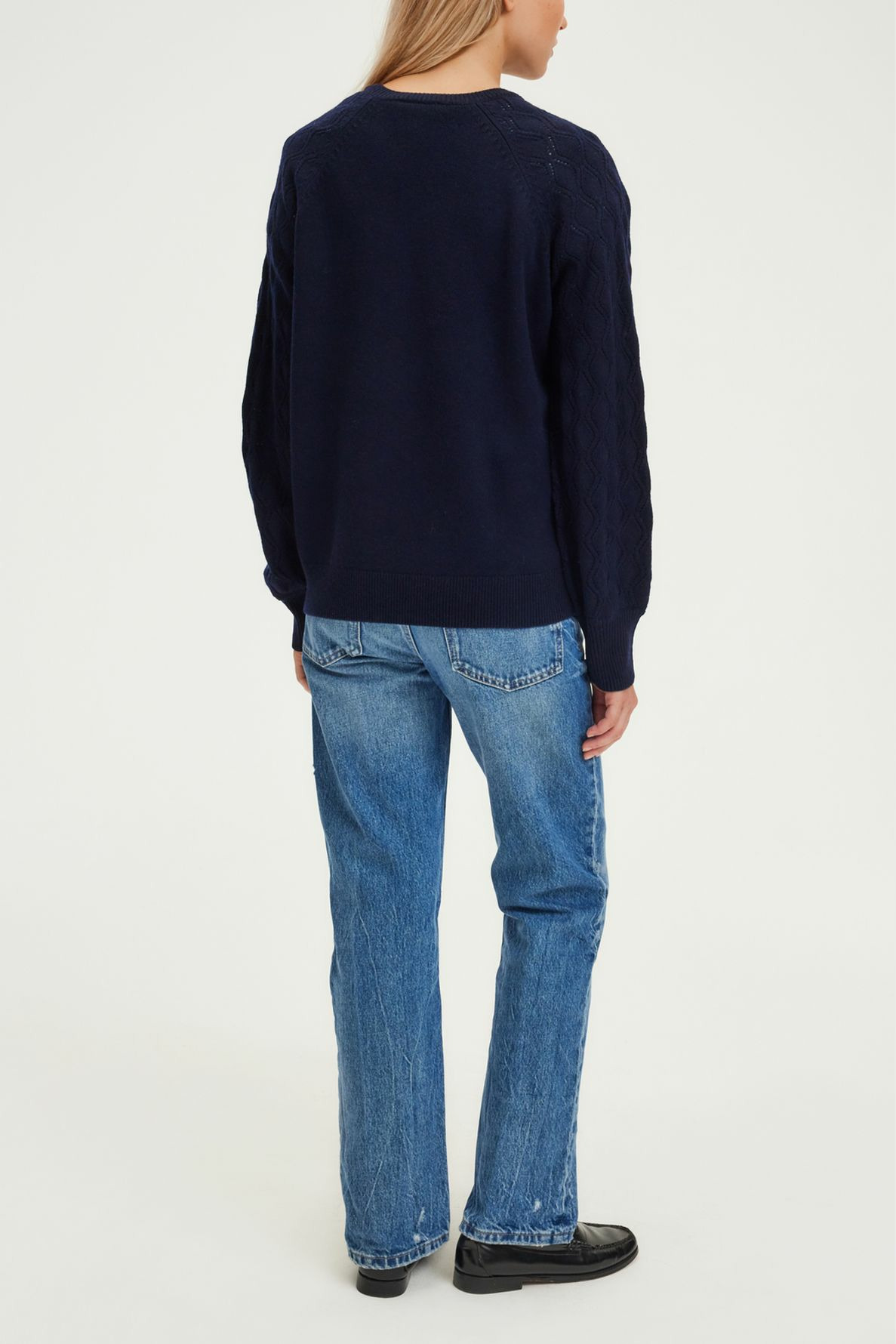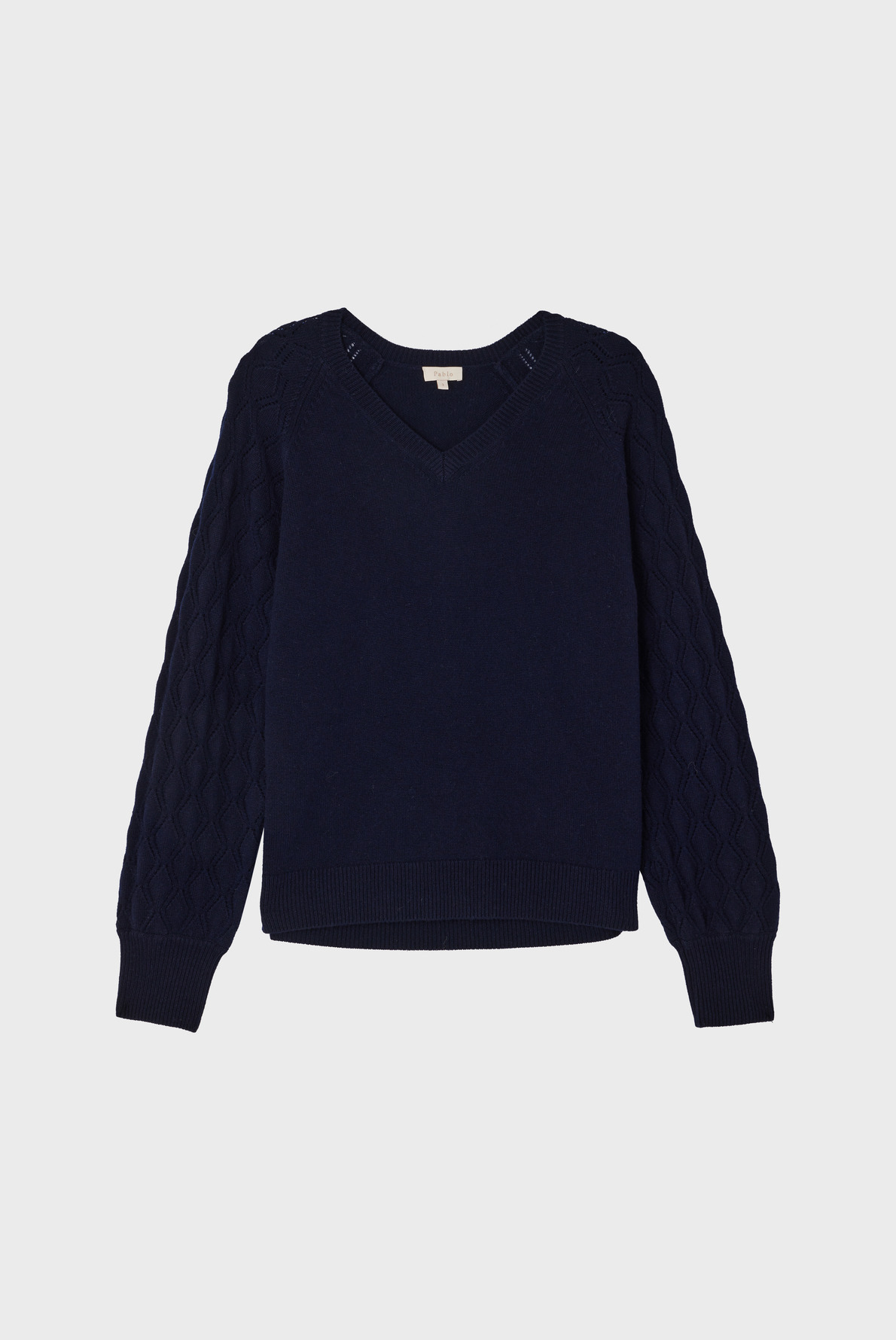 Question ? Quelles sont les particularités du design ? Réponse. Les manches longues sont ornées d’un motif losanges ajourés, et le col est en V avec des emmanchures raglan pour une meilleure aisance.