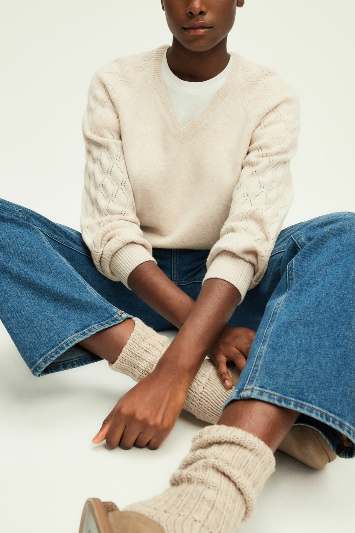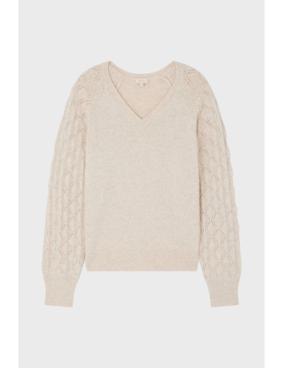 Pull en laine 100 % naturelle, manches longues avec motif losanges ajourés, col V, emmanchure raglan, forme droite, longueur standard. Finitions bord-côtes au col, bas de manches resserrés par un large bord-côtes. La mannequin mesure 177 cm et porte une taille 1.