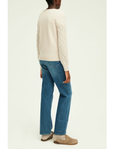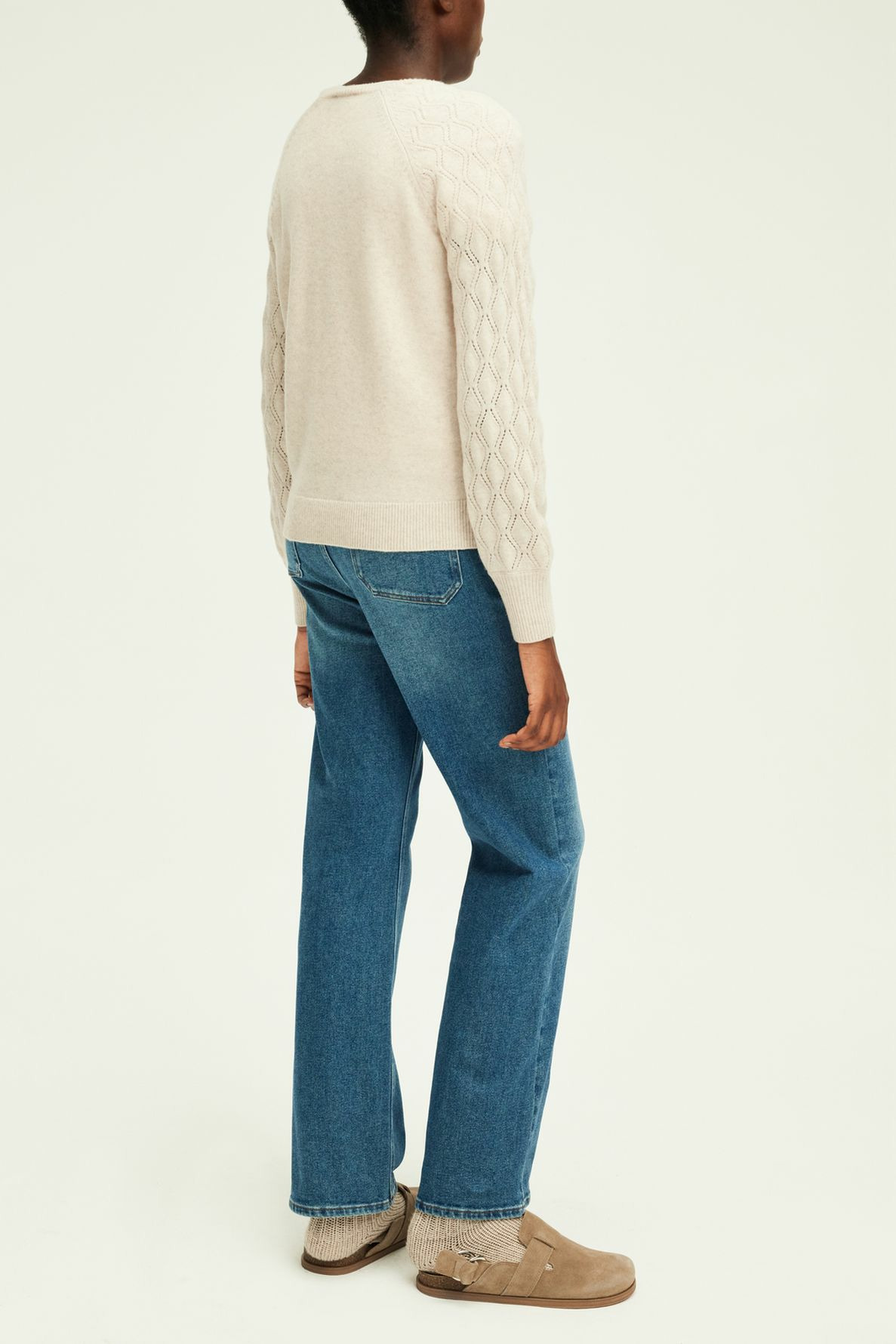 Confectionné en 100 % laine, ce pull offre une douceur naturelle et une chaleur légère, idéale pour les saisons fraîches. Les manches longues ornées de losanges ajourés créent un jeu de transparence subtil, tandis que le col V souligne délicatement le décolleté. Sa forme droite et sa longueur standard assurent une silhouette fluide et facile à associer.