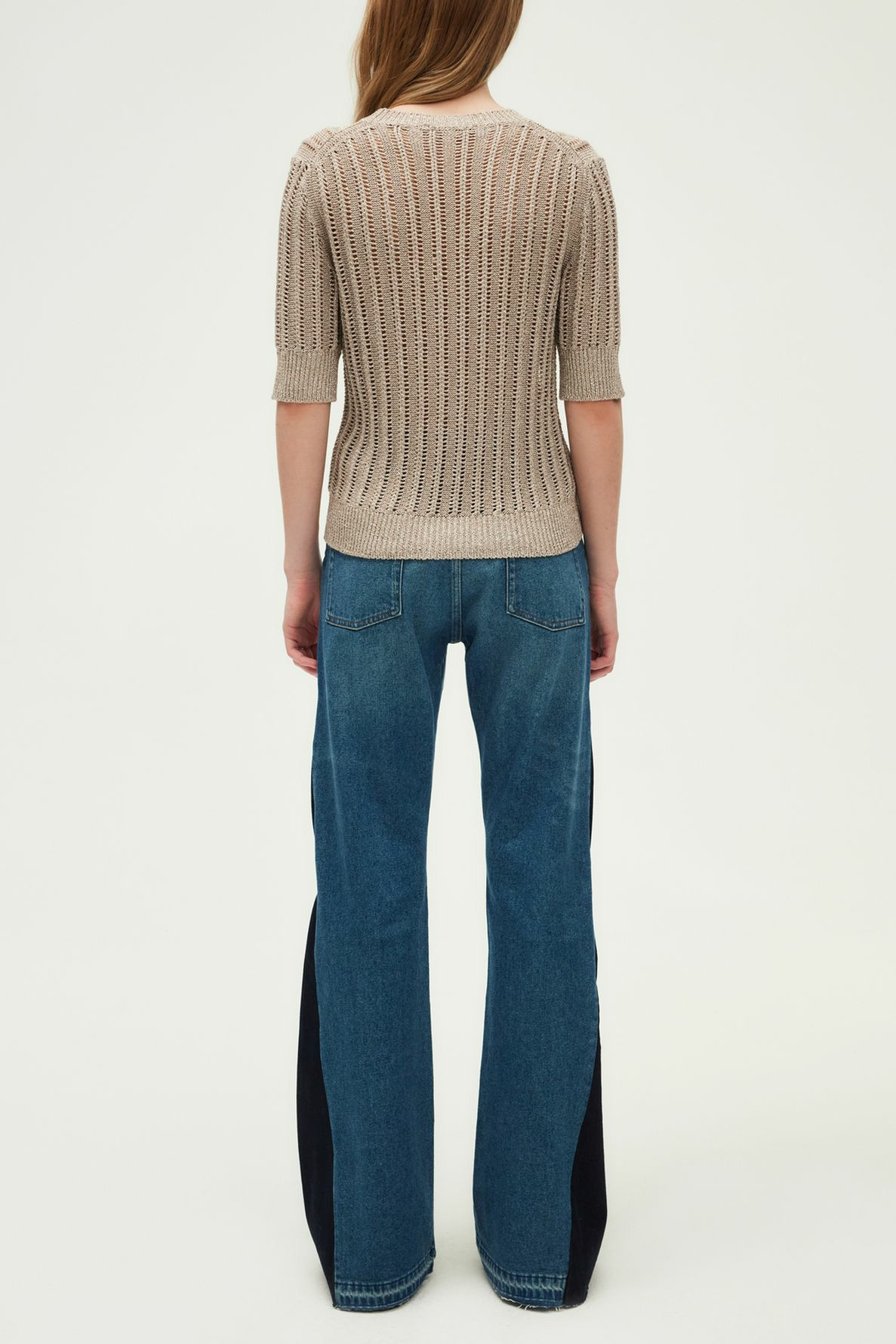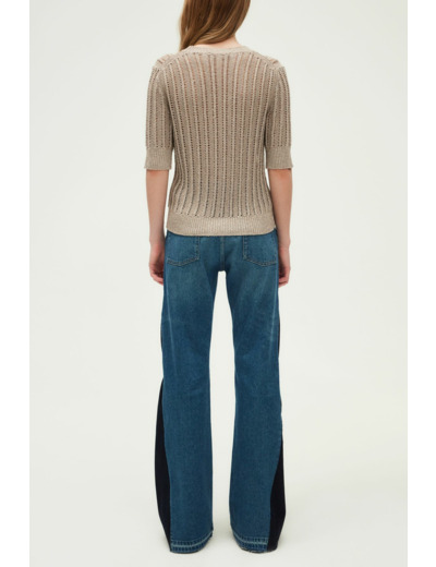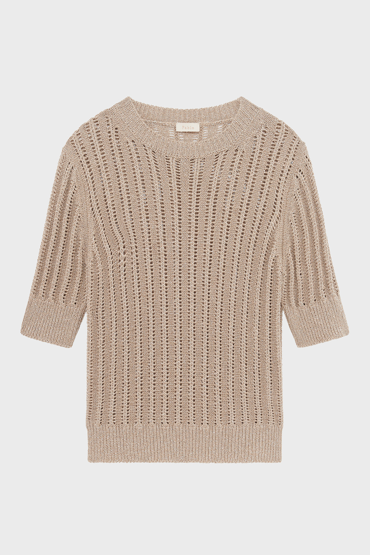 Conçu dans un esprit tricot, ce pull à la forme droite épouse délicatement la silhouette grâce à sa maille stretch. Le col rond et les manches courtes offrent un confort optimal tout en valorisant votre style, idéal pour une transition fluide entre les saisons. Son allure unie à lurex illumine subtilement votre look sans en faire trop.